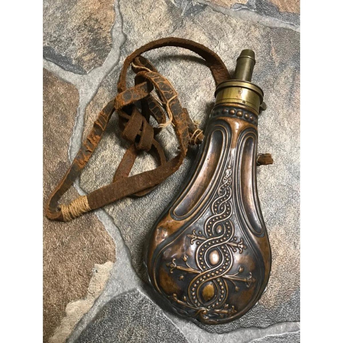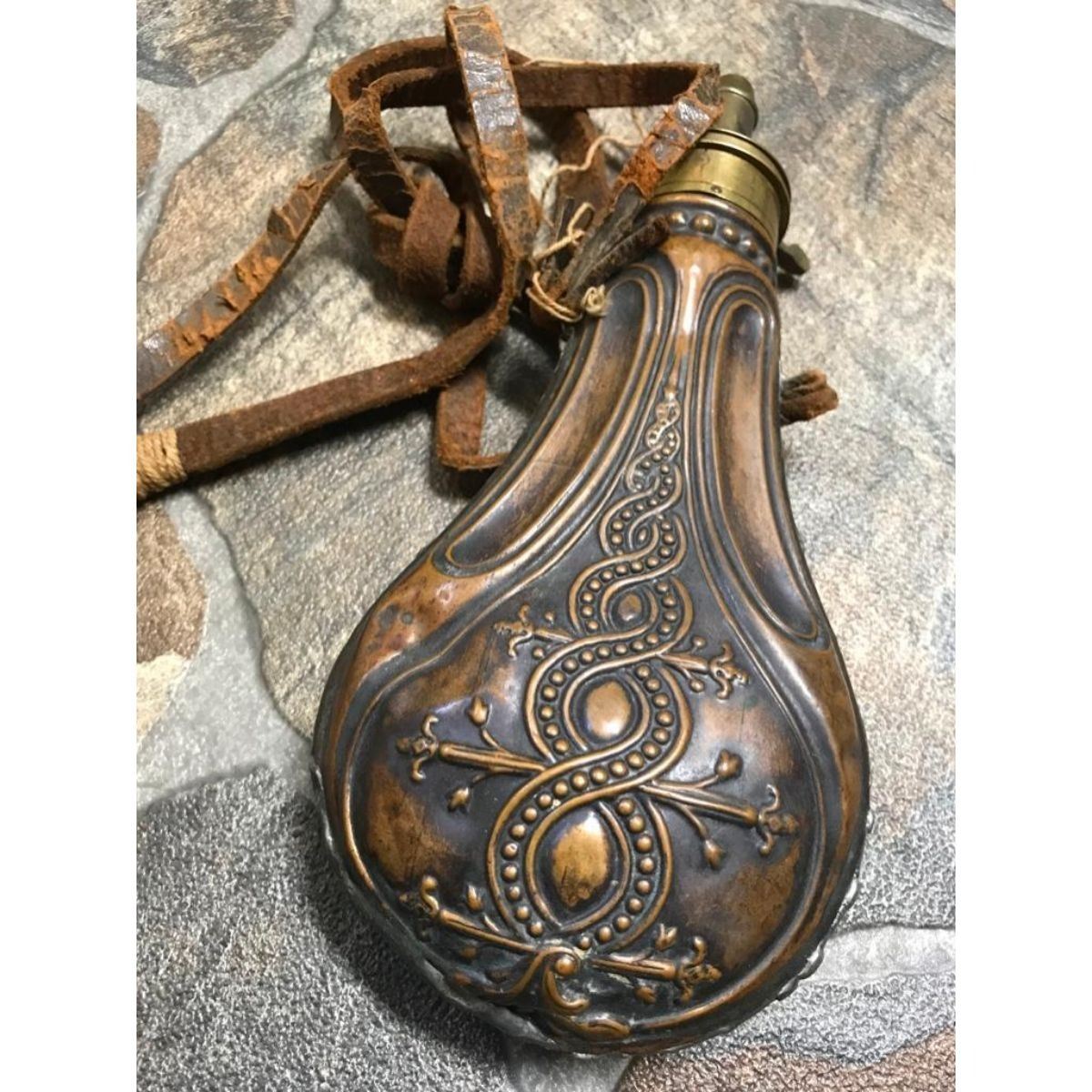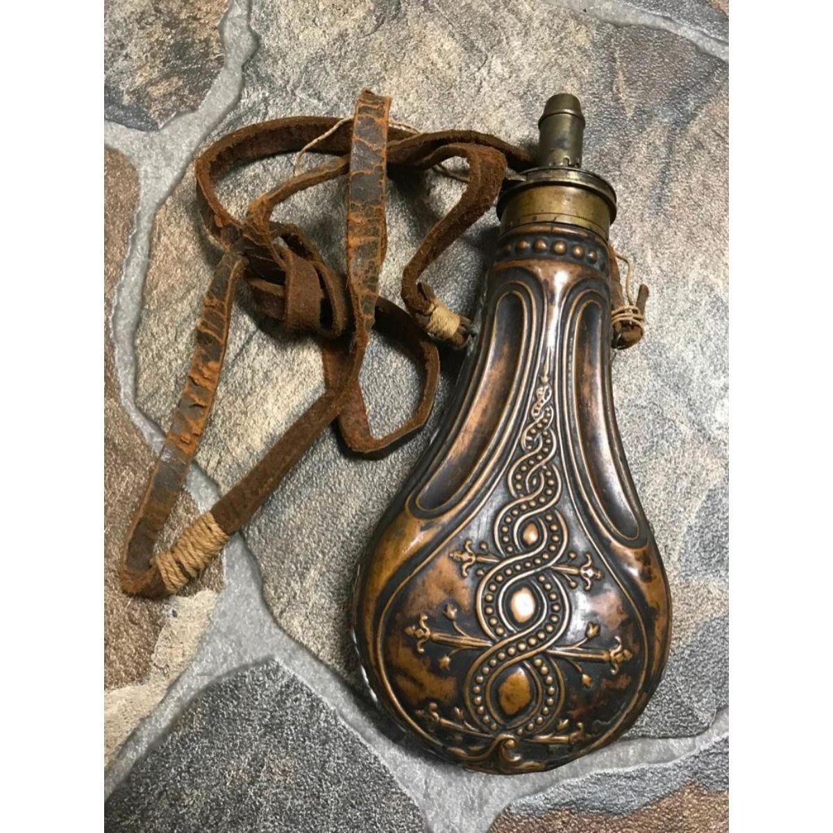 19th Century copper & brass powder flask with ornate design & original leather straps. 8" L x 3 1/2" W.Â
