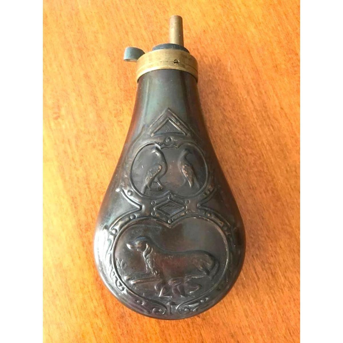 19thc copper & brass powder flask embossed with a hunting dog & pheasants design on both sides.Â