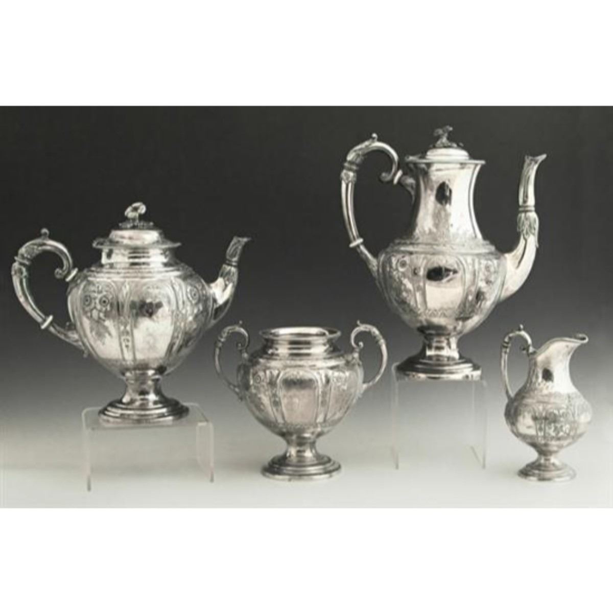 19thc English four piece silver-plated Aesthetic coffee set by William Wheatcroft Harrison, Sheffield, consisting of a coffee pot, tea pot, creamer and open sugar (4 Pcs.), Coffee Pot- H.- 11 1/4 in., W.- 9 in., D.- 5 3/4 in. 9939-032418-IN-00116