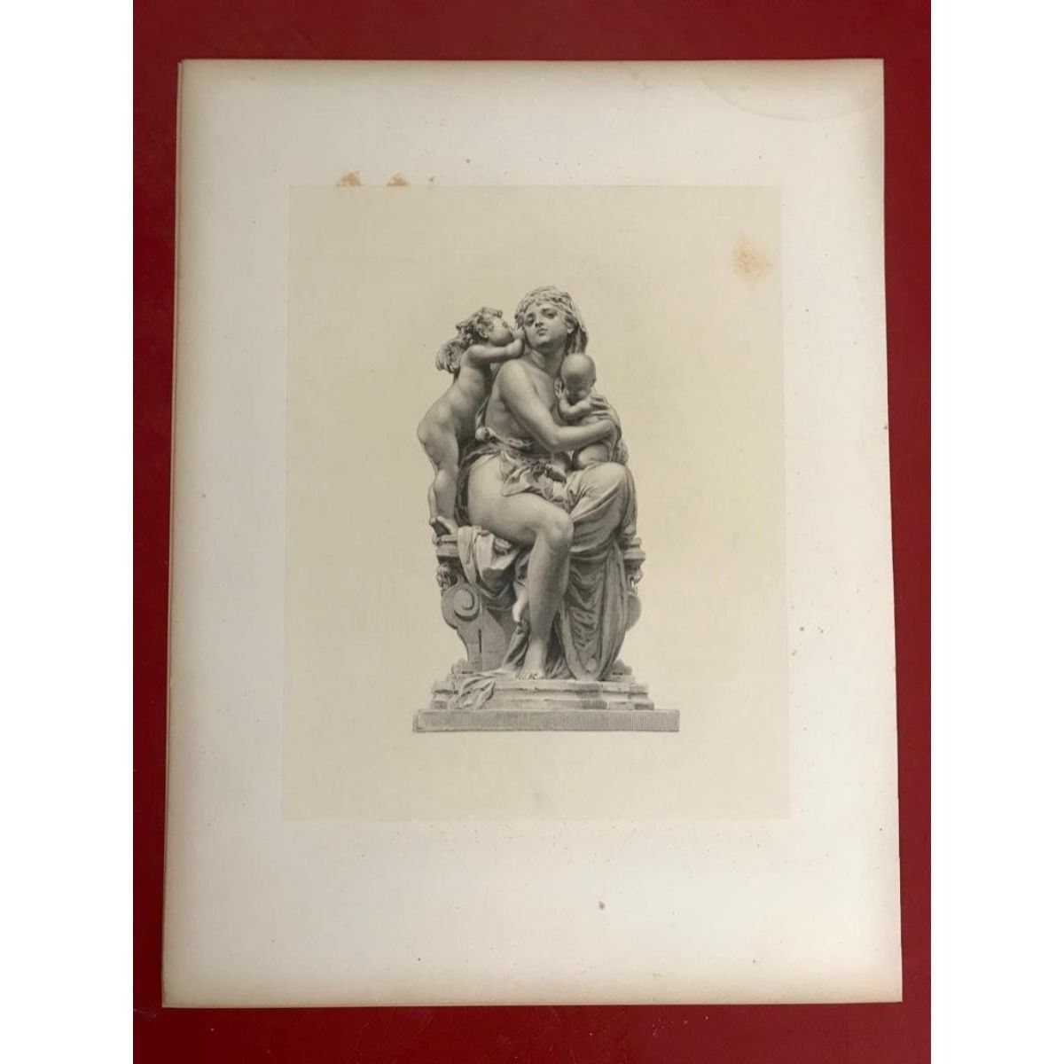 19th Century photogravure engraving, A.E. Carrier-Belleuse sculpture, "Between Two Loves". Engraved by Roffe. Depicts the sculpture of a mother with her two children. Book plate from an 1882 edition of Etudes in Modern French Art. 10" X 13". * some light foxing & discoloration to the top right margin, per photos.