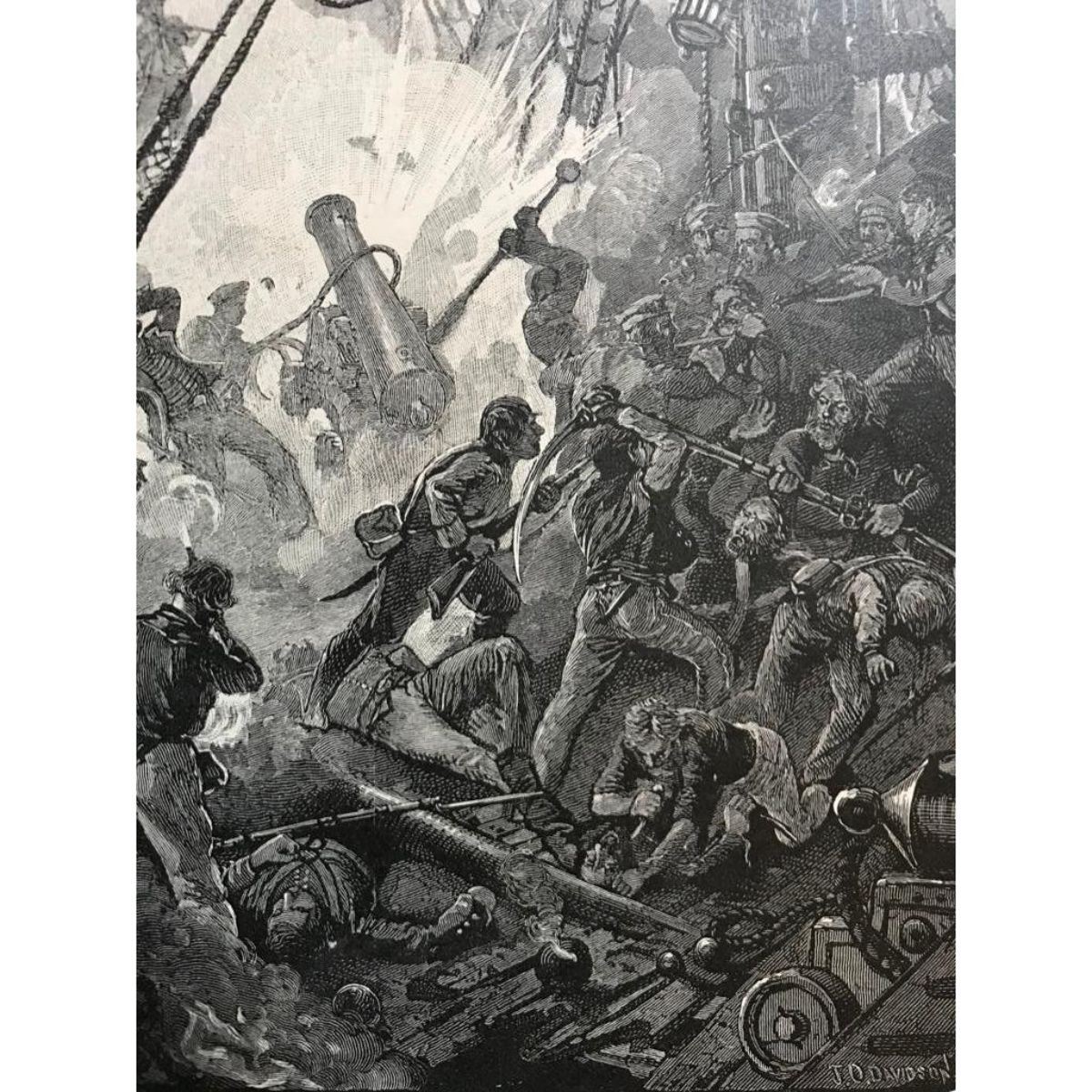 1881 bookplate engraving of the famous 1779 naval battle scene, "Fight of the Bon Homme Richard And the Serapis" by J. O Davidson. Approx 6" X 9 3/4". Â