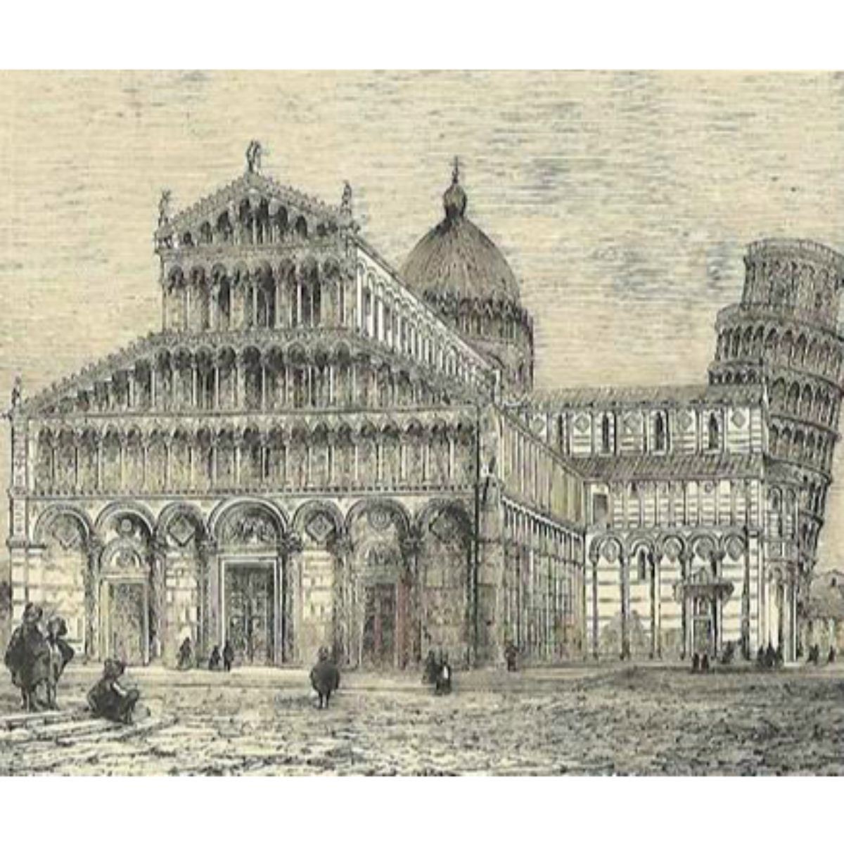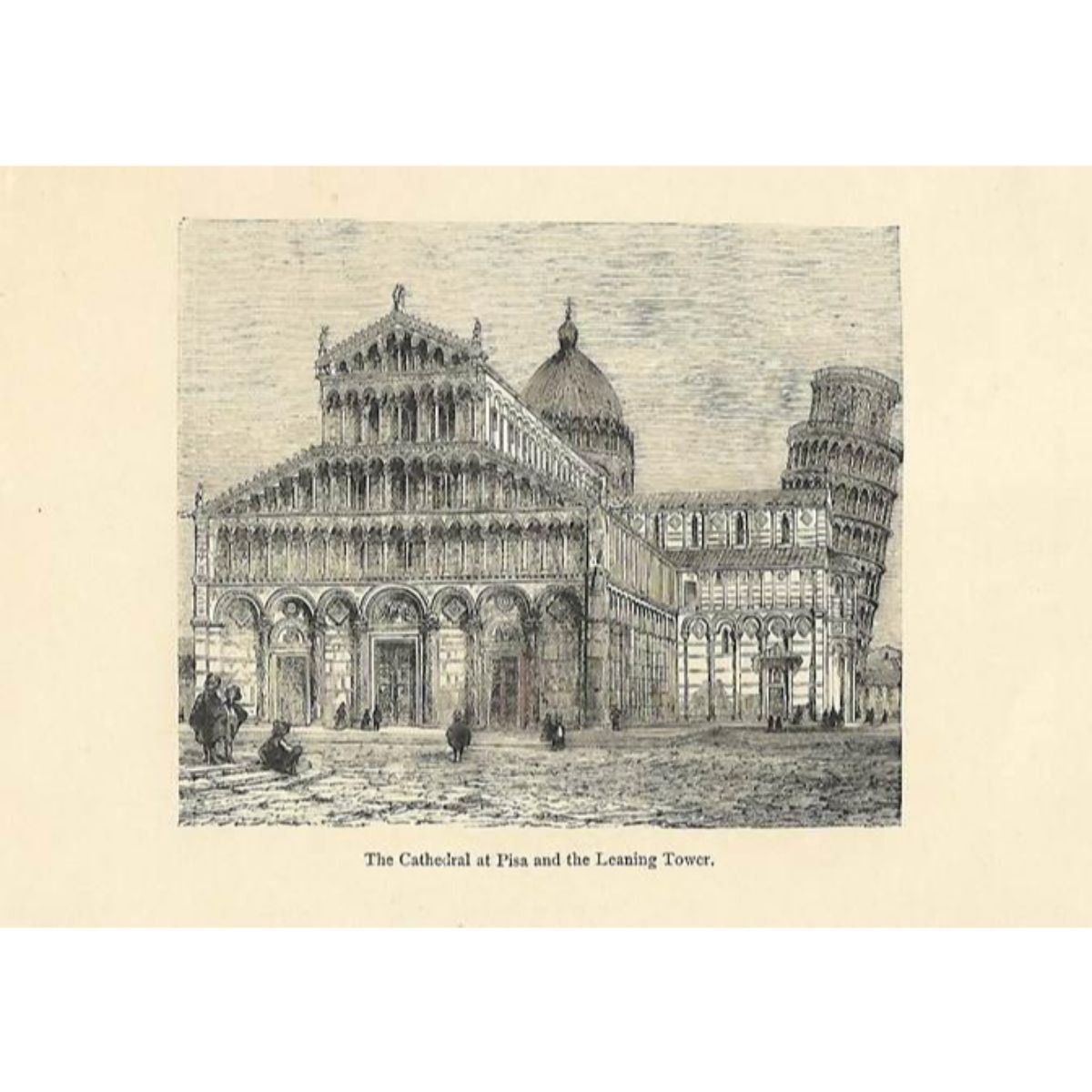 Book plate print, engraving from a 19th Century book on Italian art & history. The Cathedral at Pisa and the Leaning Tower. Â 4 3/4" X 6 1/2".