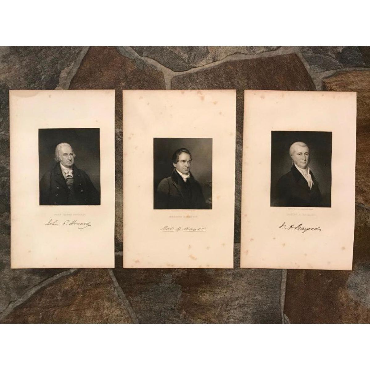 19th Century steel engravings of famous 18th-19th Century politicians from Maryland, South Carolina & Delaware - John Eager Howard, Robert Y. Hayne & James A. Bayard. Approx 6" X 10" each, suitable for framing. John Eager Howard ( 1752 - 1827 ) was an American soldier and politician from Maryland, elected as governor of the state in 1788, and served three one-year terms. He also was elected to the Continental Congress, the Congress of the United States. Robert Young Hayne ( 1792 -1839 ) was an American lawyer, planter and politician, serving in the United States Senate from 1823 to 1832, as Governor of South Carolina 1832–1834, and as Mayor of Charleston 1836–1837.  James Asheton Bayard Sr. ( 1767 -1815 ) was a lawyer and politician from Wilmington, Delaware. He was a member of the Federalist Party, who served as U.S. Representative from Delaware and U.S. Senator from Delaware.  Â
