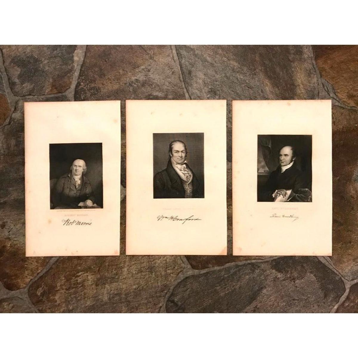 Set of 19th Century steel engravings of  famous financiers, treasurers for the United States in the 18th & early 19th Centuries. 6 1/2" X 10 1/2" each. Includes: Robert Morris ( 1734 - 1806 ) was an English-born merchant and a Founding Father of the United States. He served as a member of the Pennsylvania legislature, the Second Continental Congress, and the United States Senate, and he was a signer of the Declaration of Independence, the Articles of Confederation, and the United States Constitution. From 1781 to 1784, he served as the Superintendent of Finance of the United States, becoming known as the "Financier of the Revolution." Along with Alexander Hamilton and Albert Gallatin, he is widely regarded as one of the founders of the financial system of the United States Levi Woodbury ( 1789- 1851 ) was an American attorney, jurist, and Democratic politician from New Hampshire. During a four-decade career in public office, Woodbury served as Associate Justice of the Supreme Court of the United States, a United States Senator, the 9th Governor of New Hampshire, and cabinet member in the Andrew Jackson and Martin Van Buren administrations. He was promoted as a candidate for the Democratic nomination for President of the United States in 1848. William Harris Crawford ( 1772 - 1834 ) was an American politician and judge during the early 19th century. He served as US Secretary of War and US Secretary of the Treasury before he ran for US president in the 1824 election.