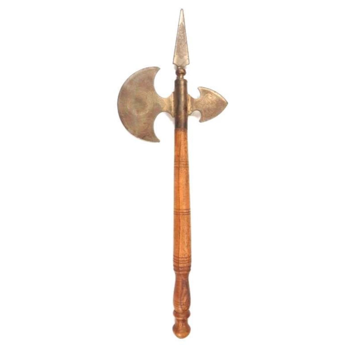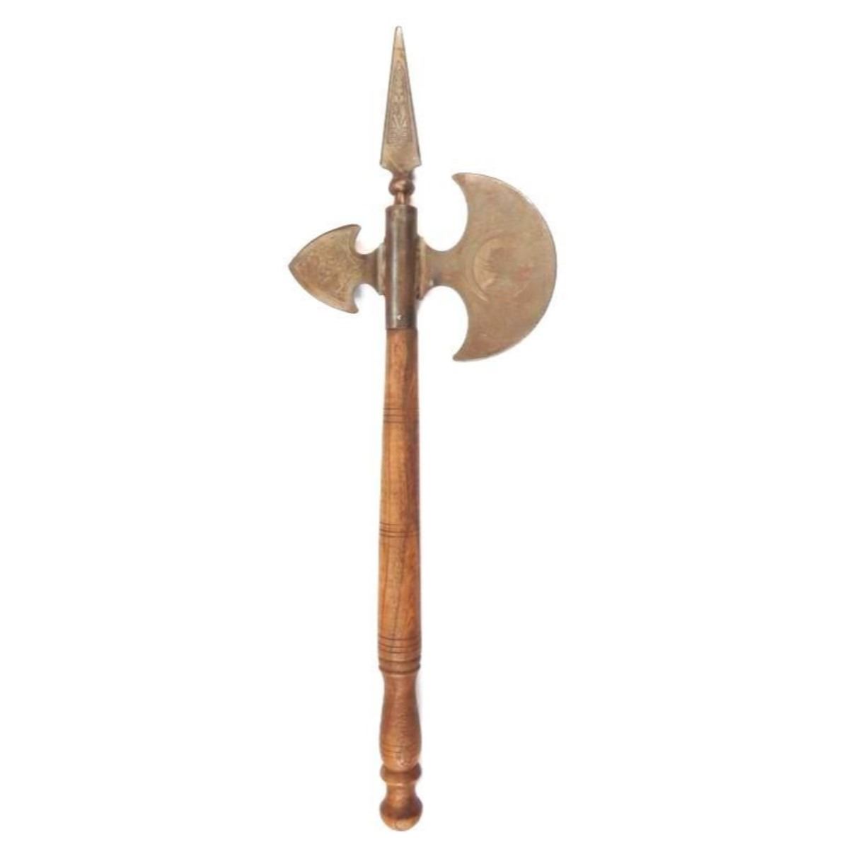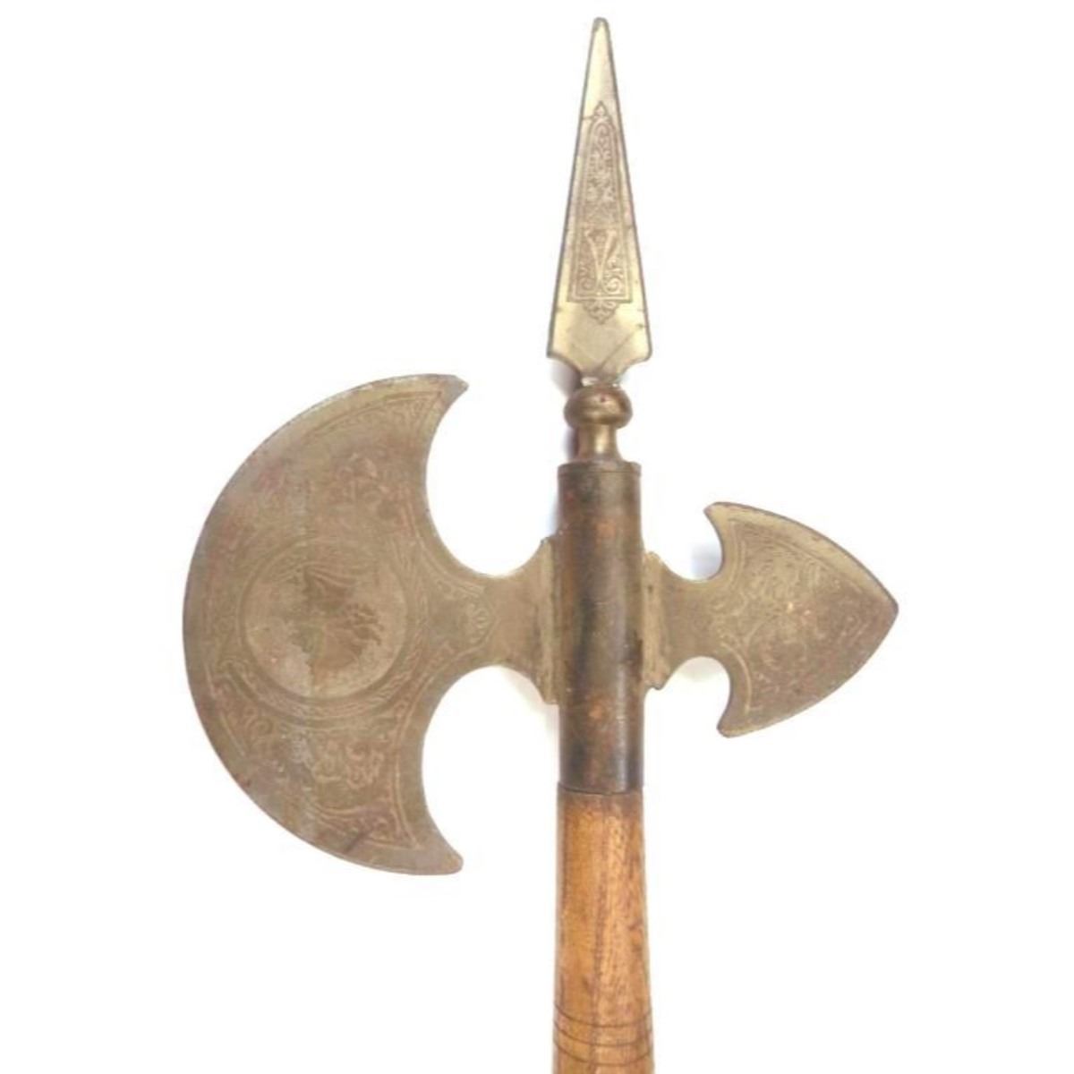19thc steel battle ax with highly ornate etched blade. 9" W X 6"H ax blade. 25" overall length.