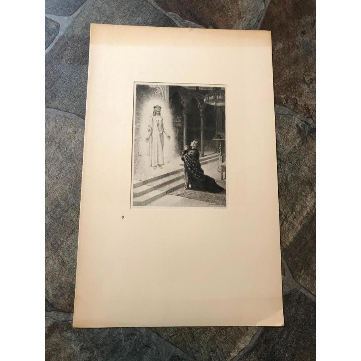 c.1890 French etching by Francois Xavier Le Sueur, Adrien Moreau's Le Secret De St. Louis. Displayed in aged folio. * cover of folio darkened at the top & a crease to bottom right that do not affect the etching. 11' X 17 1/2" folio. 6 1/2" X 8 1/2" etching size.