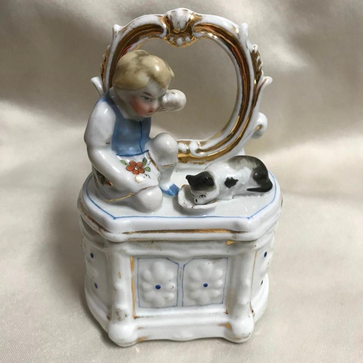 19th-century German Conta Boehme Victorian fairing trinket box, depicting a little boy wiping tears & a kitty cat eating from a saucer. Vivid colors & most of gilt remaining. #90 on bottom. The underside of lid stamped 172 & 3509, as well as the Conta Boehme shield stamp. 3 1/4" W X 2 1/4" D X 4 1/4" H. * Fairing boxes were created as prices or rewards won or "fairly earned" at carnivals & fairs during Victorian times.