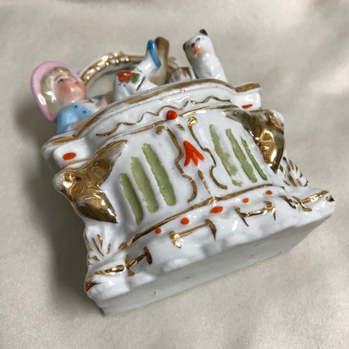 19thc German Victorian porcelain fairing trinket box, little boy with pink hatkitty catatop a dresser Vivid colors & most of gilt remaining. #3636 stamped inside, along with Conta Boehme shield stamp. * hairline crack appears on inside of top piece. 3 1/4" W X 2 1/4" D X 4 1/2" H.