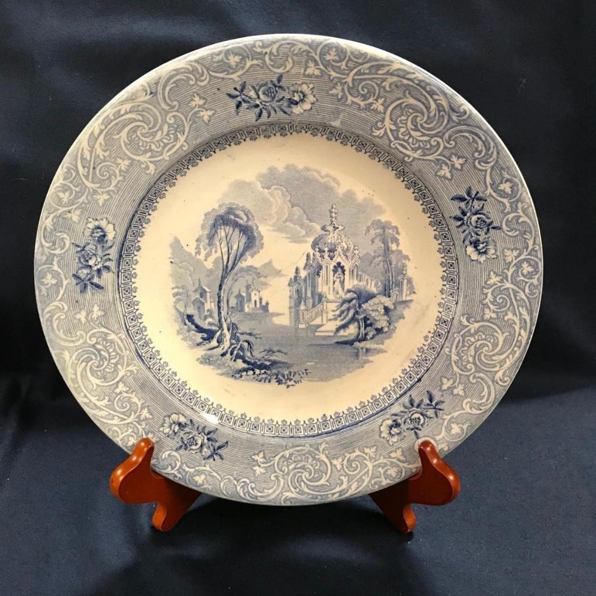 1850's gothic theme, blue transfer ware ironstone plate. Stamped on the reverse, "Davenport, Ironstone, China, 56 " with an anchor. 10 1/2" D. Provenance; display piece from an 1850's South Carolina plantation house museum.Â
