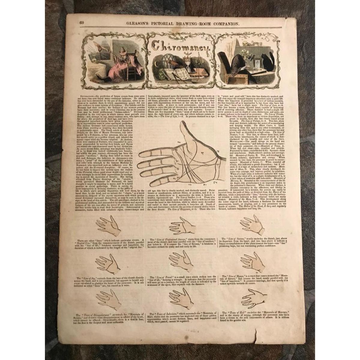 Hand-colored large book page on Palm Reading: "Chiromancy". Engraved illustrations, from an 1854 issue of Gleason's Pictorial. The article describes the art of palm reading, and explains the meanings of the lines on the human hand. 11"x16". Â