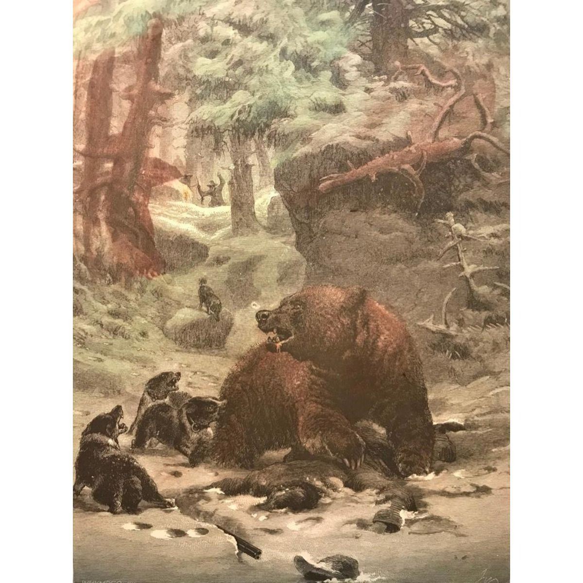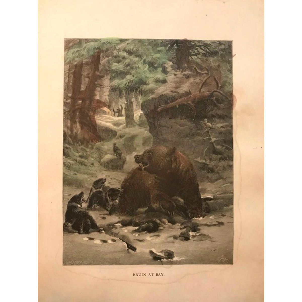 Hand-colored engraving from an 1874 book, "Bruin At Bay" Grizzly Bear fighting hunting dogs by Joseph Wolf. Partial hand-coloring. 9" X 12". * water stains to the engraving, some smearing of watercolor as well.Â