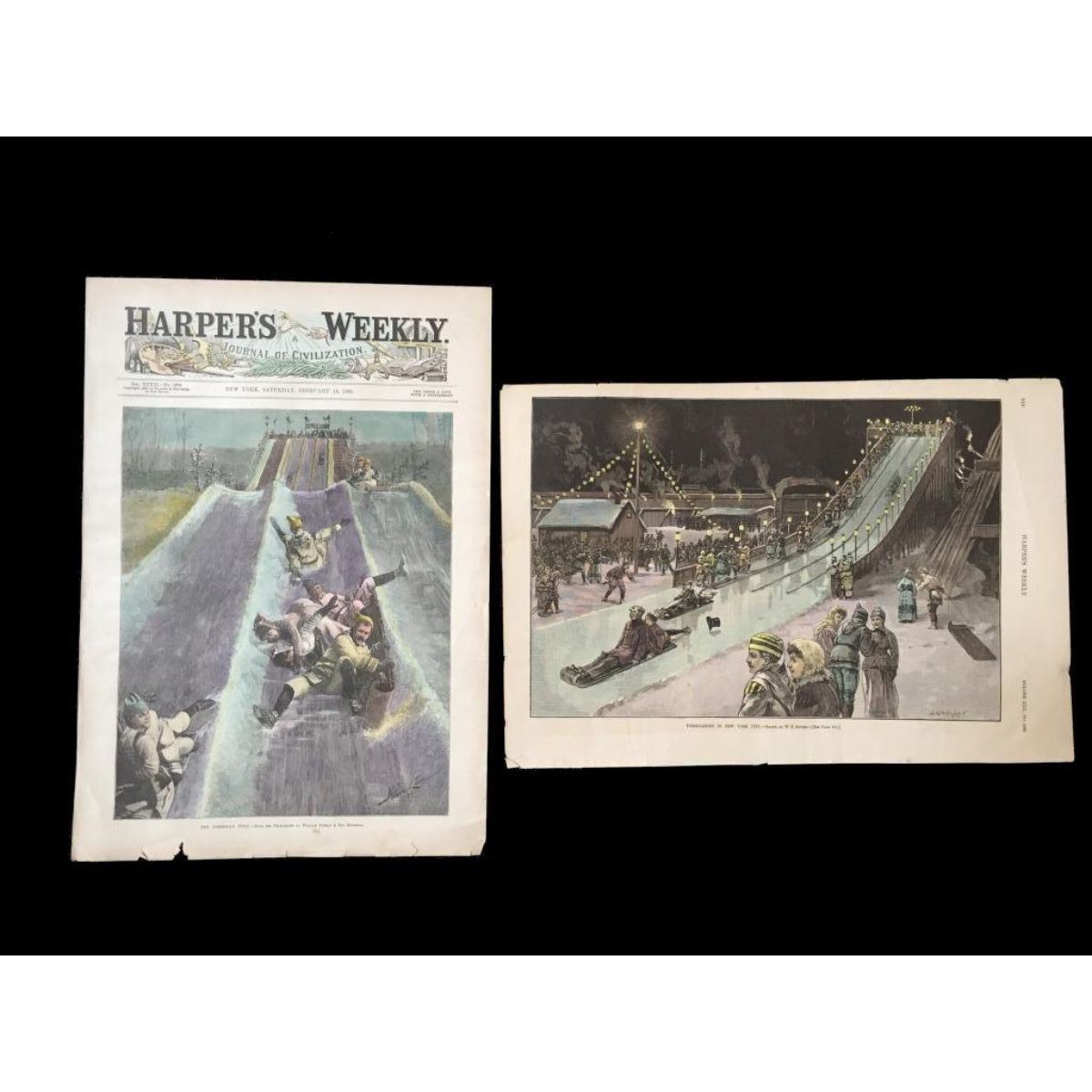 Pair of 19th Century hand-colored wood cut engravings from Harper's Weekly illustrated newspapers. Includes - Feb 1889 front cover, depicting 5 men falling off a toboggan entitled "The Toboggan Spill". 11" X 16" &Dec 25, 1886 full page entitled "Tobogganing in New York City". 11" X 16". * minor tears along the edges of the paper, does not affect the images.