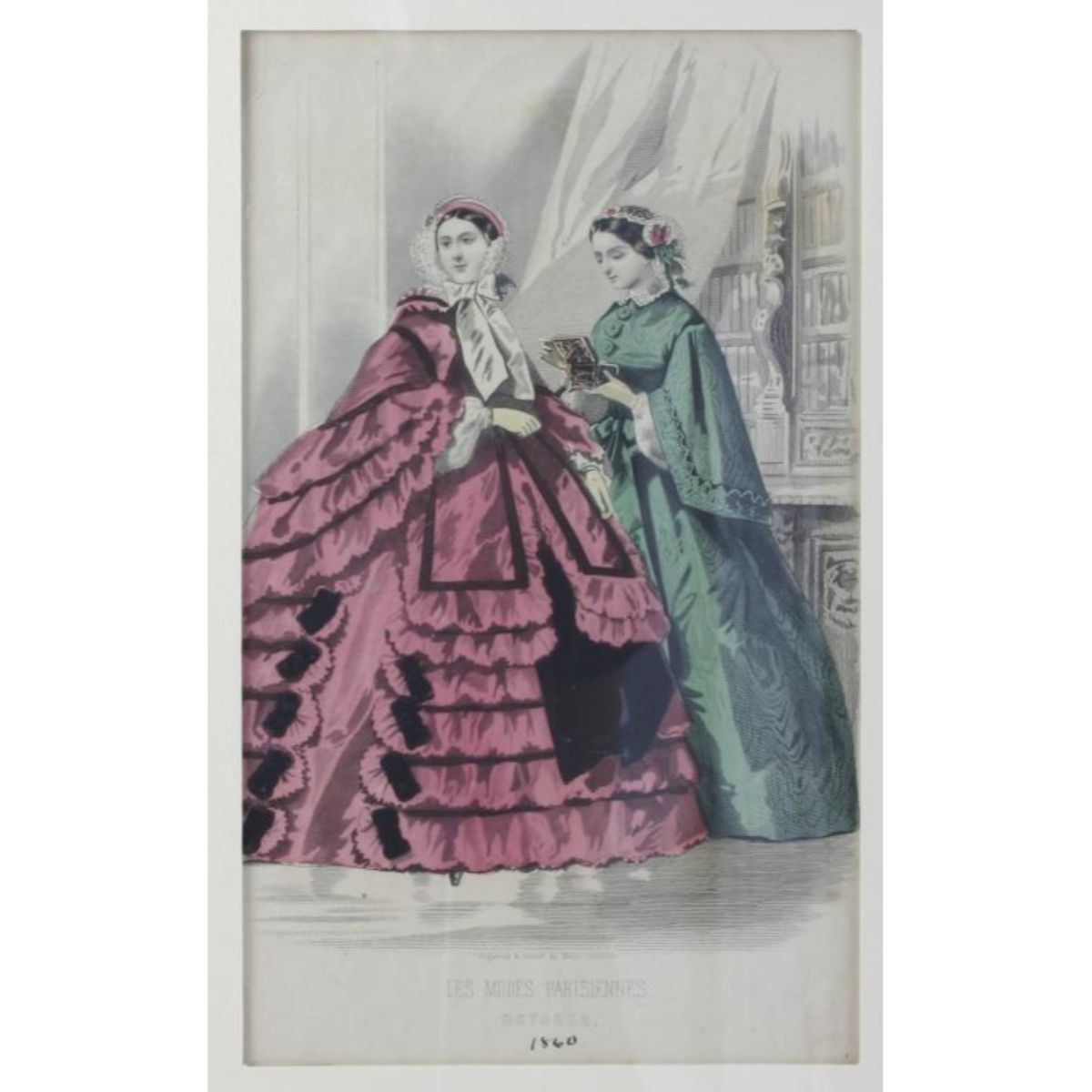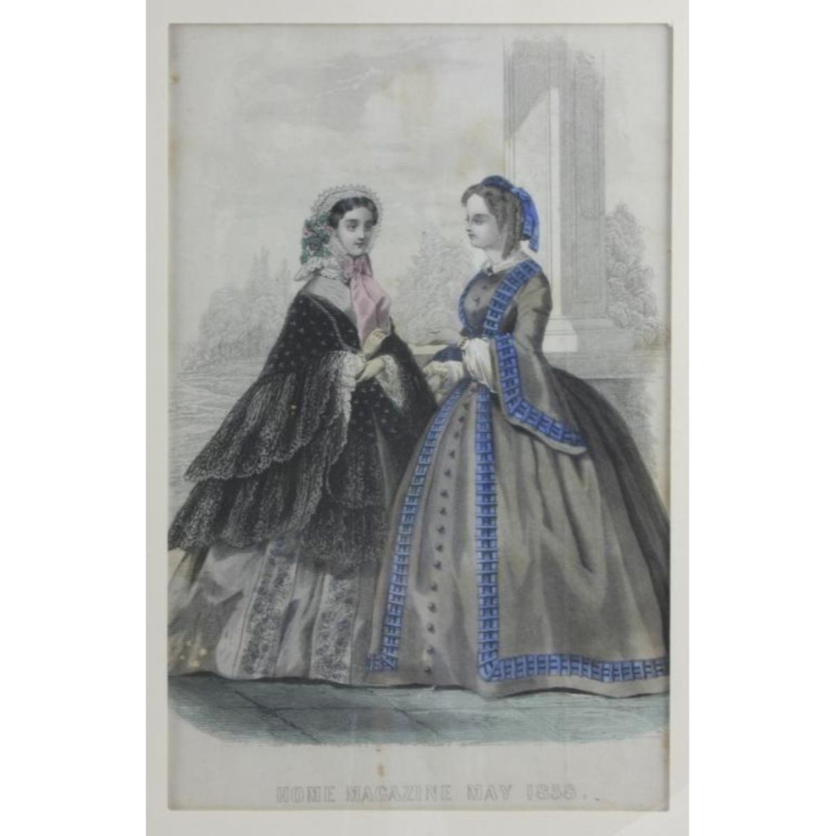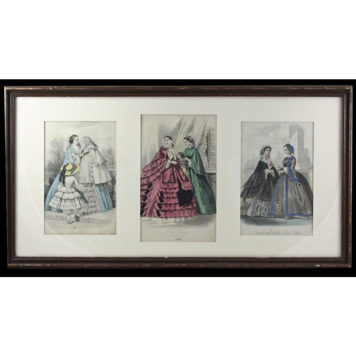 Framed grouping of 1850's - 1860 ladies hand-colored engravings, showing the fashions of the day. * vintage frame with wear to the outside, as seen in photos.