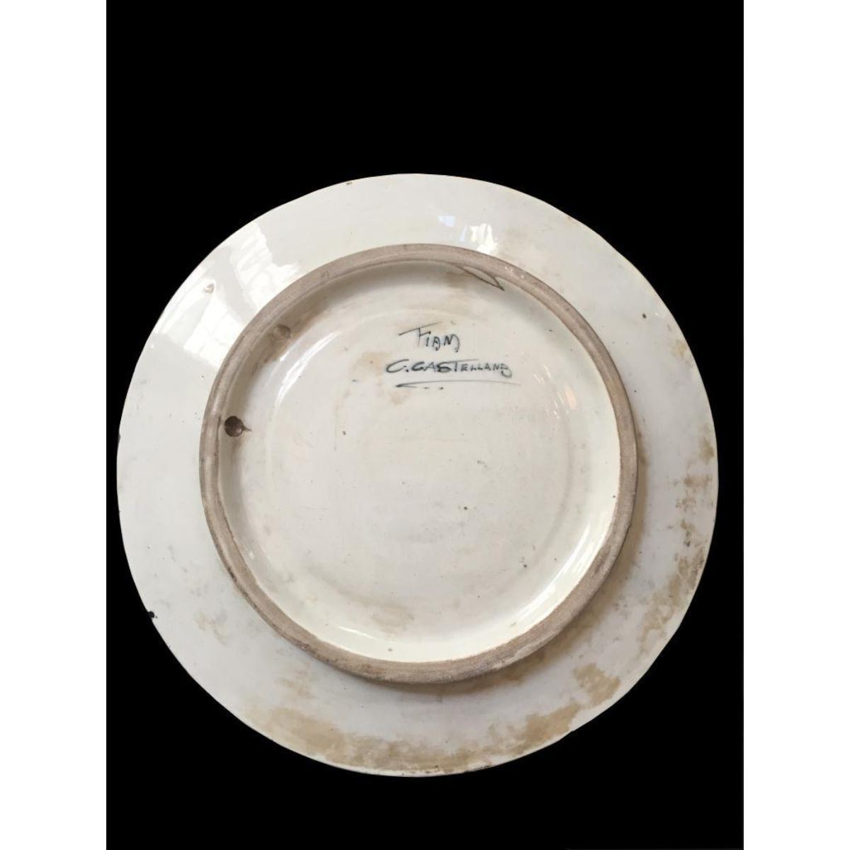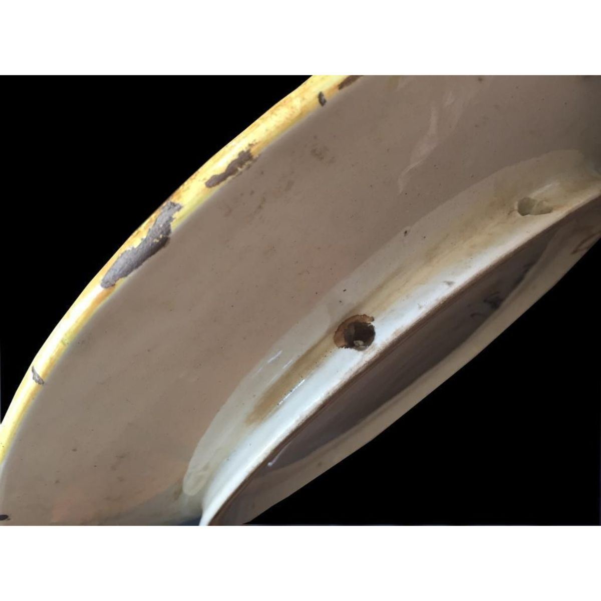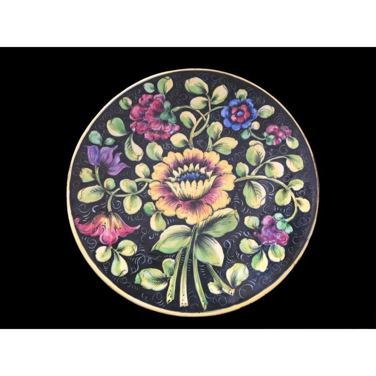 Beautiful black ground with a bright yellow & lime green center focus floral, sprouting additional colorful flowers in blue to pink, burgundy & purple. Convex curved 14" diameter platter, resting on 1/2" raised 9 1/2"