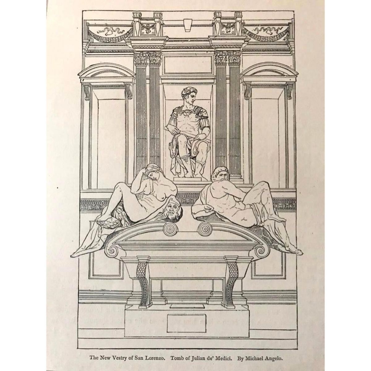 19thc black & white line drawing bookplate print, The New Vestry of San Lorenzo. Tome of Julian de" Medici. By Michael Angelo. Dusk & Dawn. Ready to be framed. 5 1/4" X 8".Â