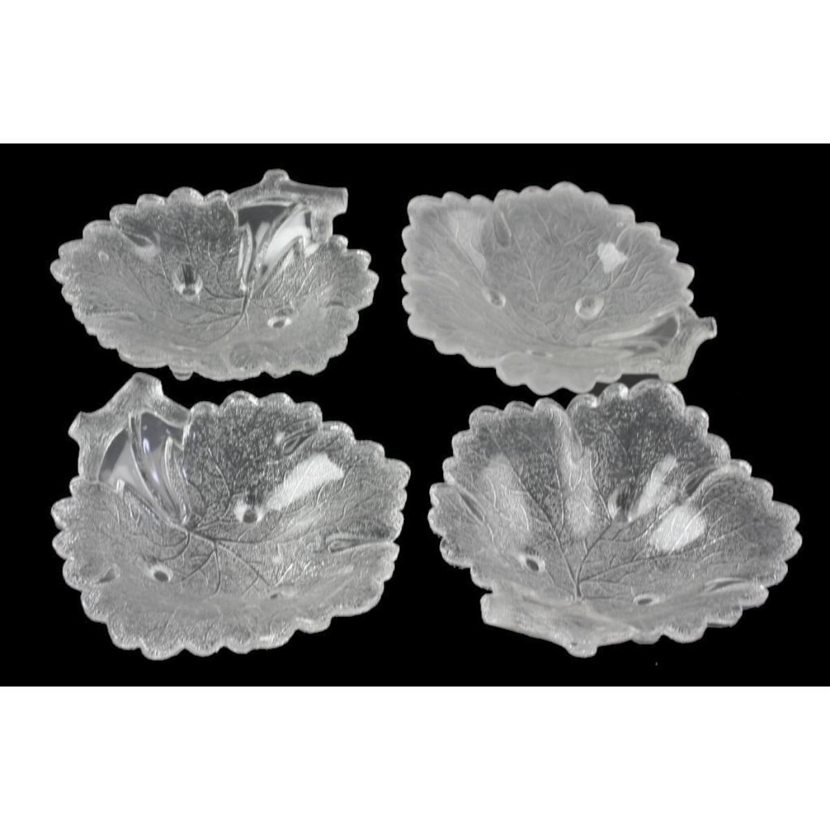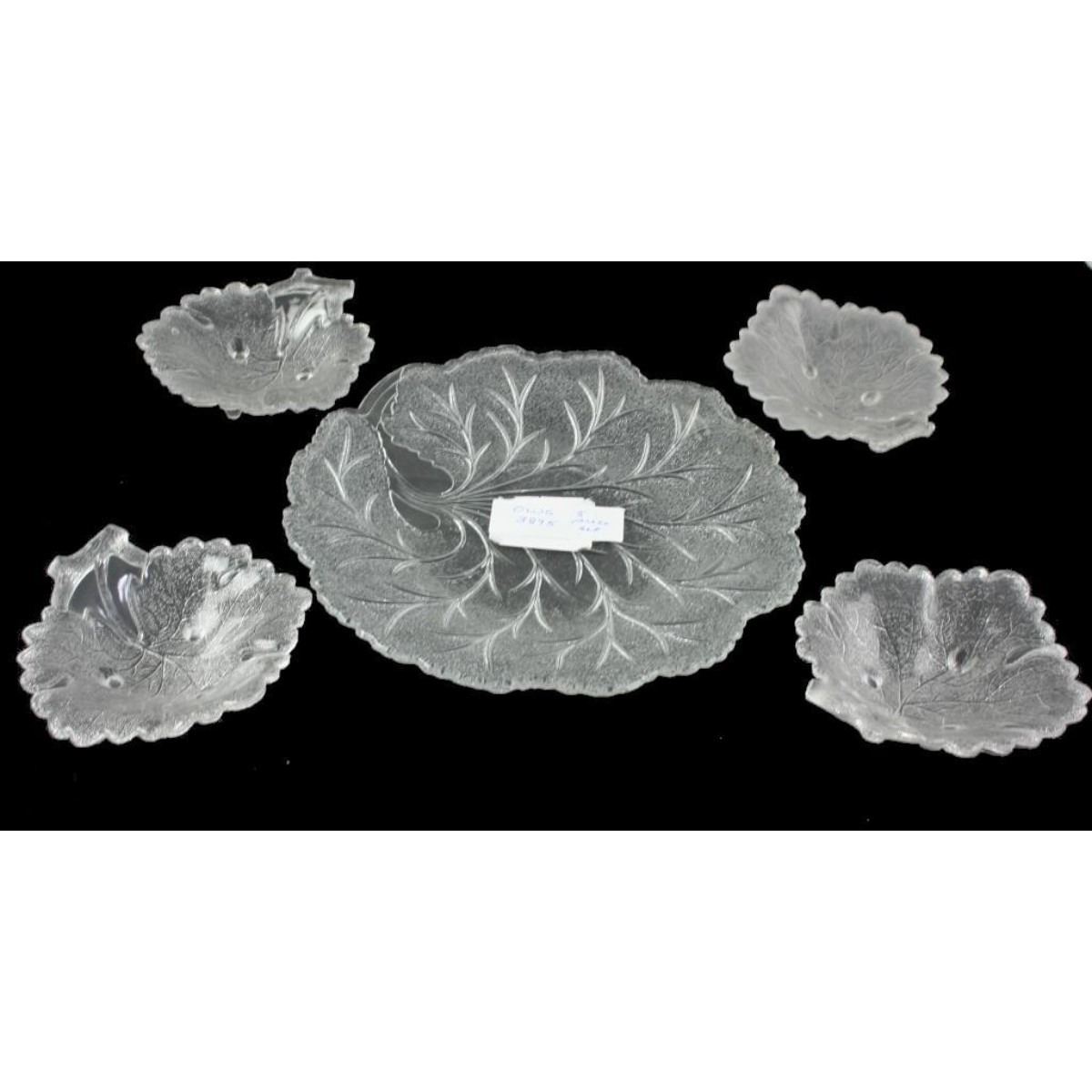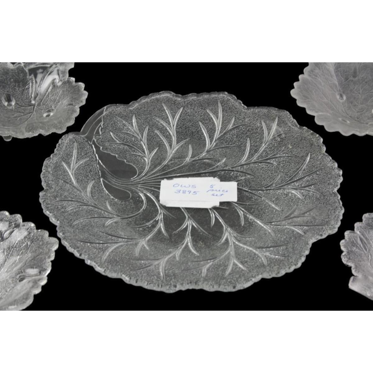 Six maple leaf ice cream dishes. Gillinder & Sons 1888, leaf on trunk of maple leaf, early American pattern glass. Ice cream/ dessert set with platter & five dishes. Platter is approx 10" D & smaller bowls/ dishes areapprox 5" D. One dish has a slightly more "vaseline" appearance than the rest of the set.