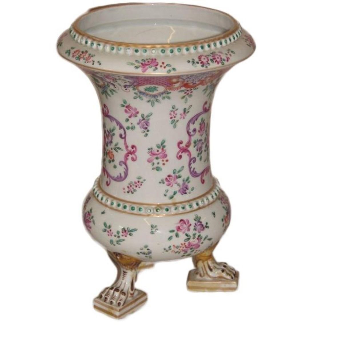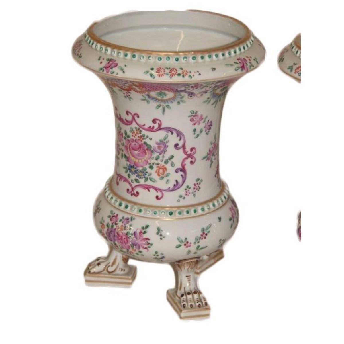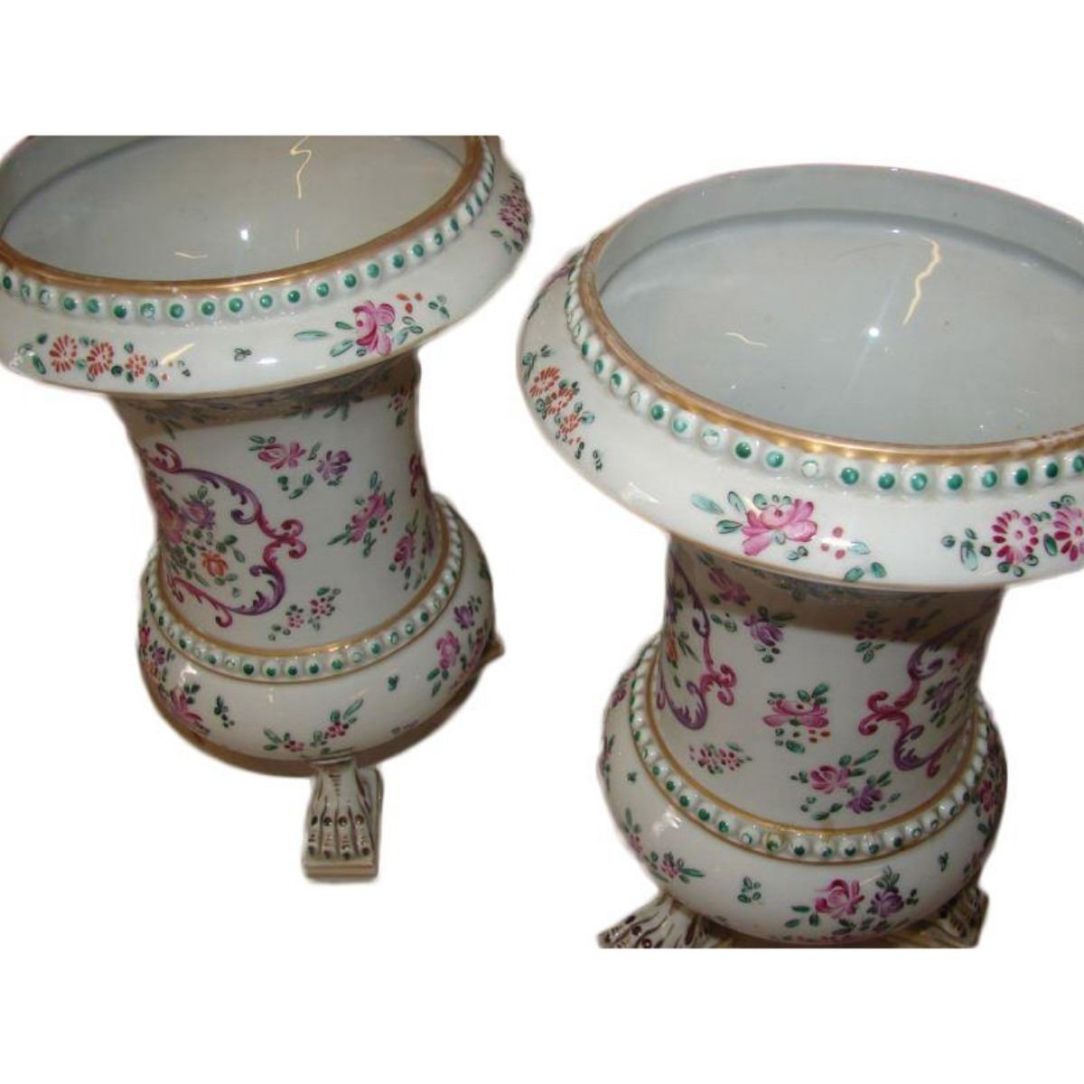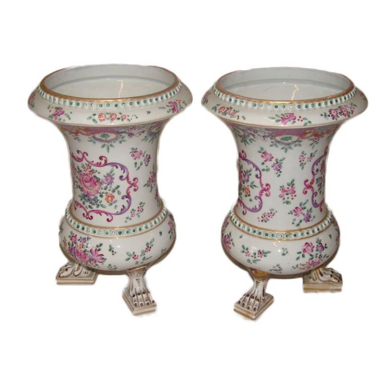 Gorgeous 19th Century Victorian matched pair of Continental tri-footed porcelain parlor vases. Hand-painted, beaded decorations of roses & ribbons with gold gilt. 8" D X 12 " H.
