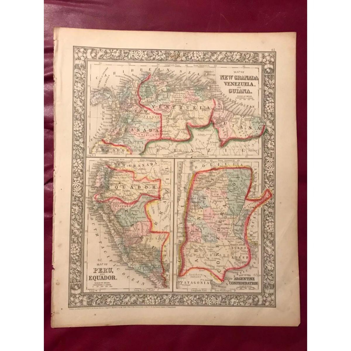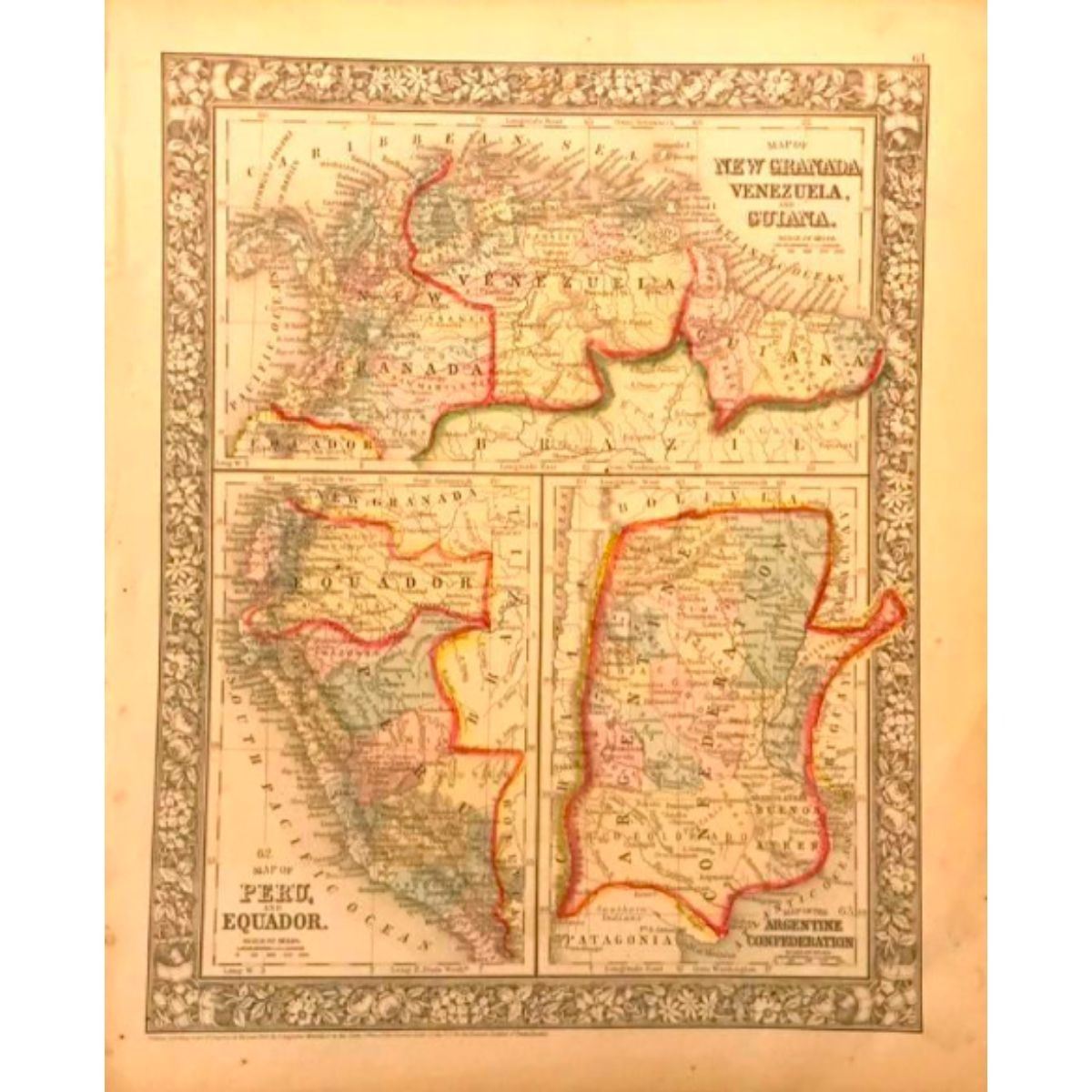 1860 Hand-colored sectioned atlas Map of New Granada Venezuela and Guiana, Map of Peru and Equador & Map of The Argentine Confederation, from the New General Atlas published by S Augustus Mitchell Jr in Pennsylvania, 1860. 15 1/4" L X 12 1/2" W.