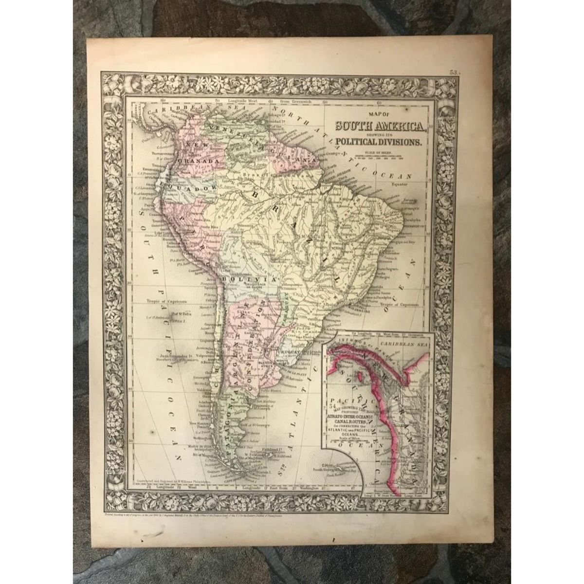 A fine example of the legendary American map publisher Samuel Augustus Mitchell Jr.'s 1866 map of South America, depicting the whole continent from Panama to Cape Horn, including the Falkland & South Georgia island groups in considerable detail. An inset map in the lower right quadrant depicts the Isthmus of Panama entitled 'Map Showing the Proposed Atrato-Inter-Oceanic Canal Routes, for Connecting the Atlantic and Pacific Oceans.' Work on the Panama Canal would begin in 1880 and be completed in 1914. Map also identifies various cities, towns, rivers & an assortment of additional topographical details. Color-coded according to political boundaries with elevation rendered by hachure. One of the more attractive American atlas maps of this region to appear in the mid-19th century. Prepared by S. A. Mitchell Jr. for inclusion as plate 53 in the 1866 issue of Mitchell's New General Atlas. Like many American map publishers of this period, Mitchell did not regularly update his copyright, consequently this map is dated and copyrighted to 1860: 'Entered according to Act of Congress in the Year 1860 by S. Augustus Mitchell Jr. in the Clerks Office of the District Court of the U.S. for the Eastern District of Pennsylvania.' Printed area measures 14" H X 11 1/2" W. Â