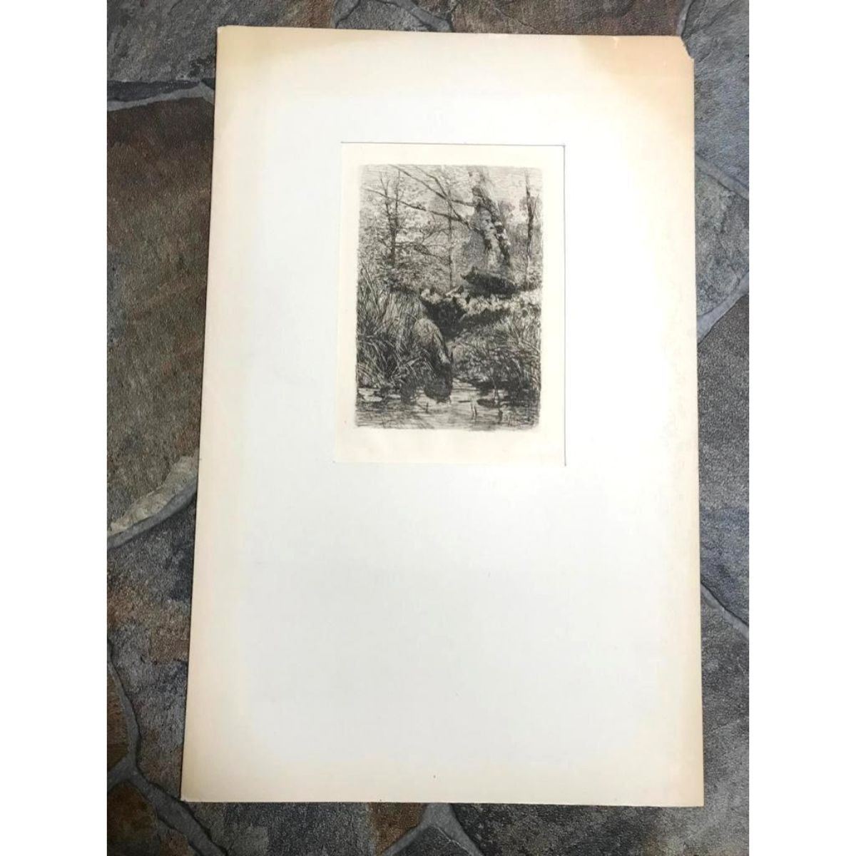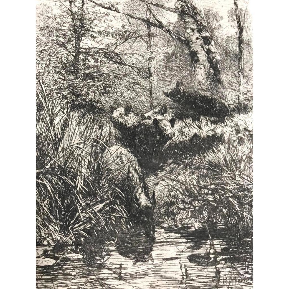 19thc original etching "Wild Boar at the Stream", Christian Johann Kroener ( German, 1838 - 1911 ). 9" X 12" displayed within portfolio. Christian Johann Kroner was born in Rinteln an der Weser in 1838 & died in Dusseldorf in 1911. He was originally a decorative painter, dedicating himself fully to art from 1861. Kroner worked autodidactically in Munich & Dusseldorf, painting mostly landscapes in the forest of Teutoburg, the Harz mountain range & the Rugen area. His works are defined by atmospheric moods & a distinctive coloring.  Kroner was awarded a gold medal at the Berlin Exposition & was a member of the Berlin Academy, as well as a professor by royal appointment. Â