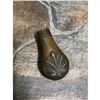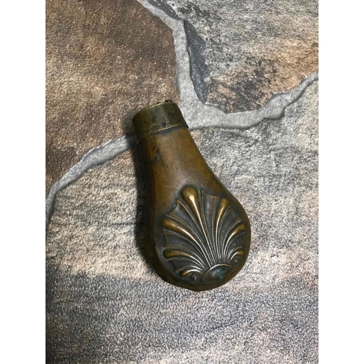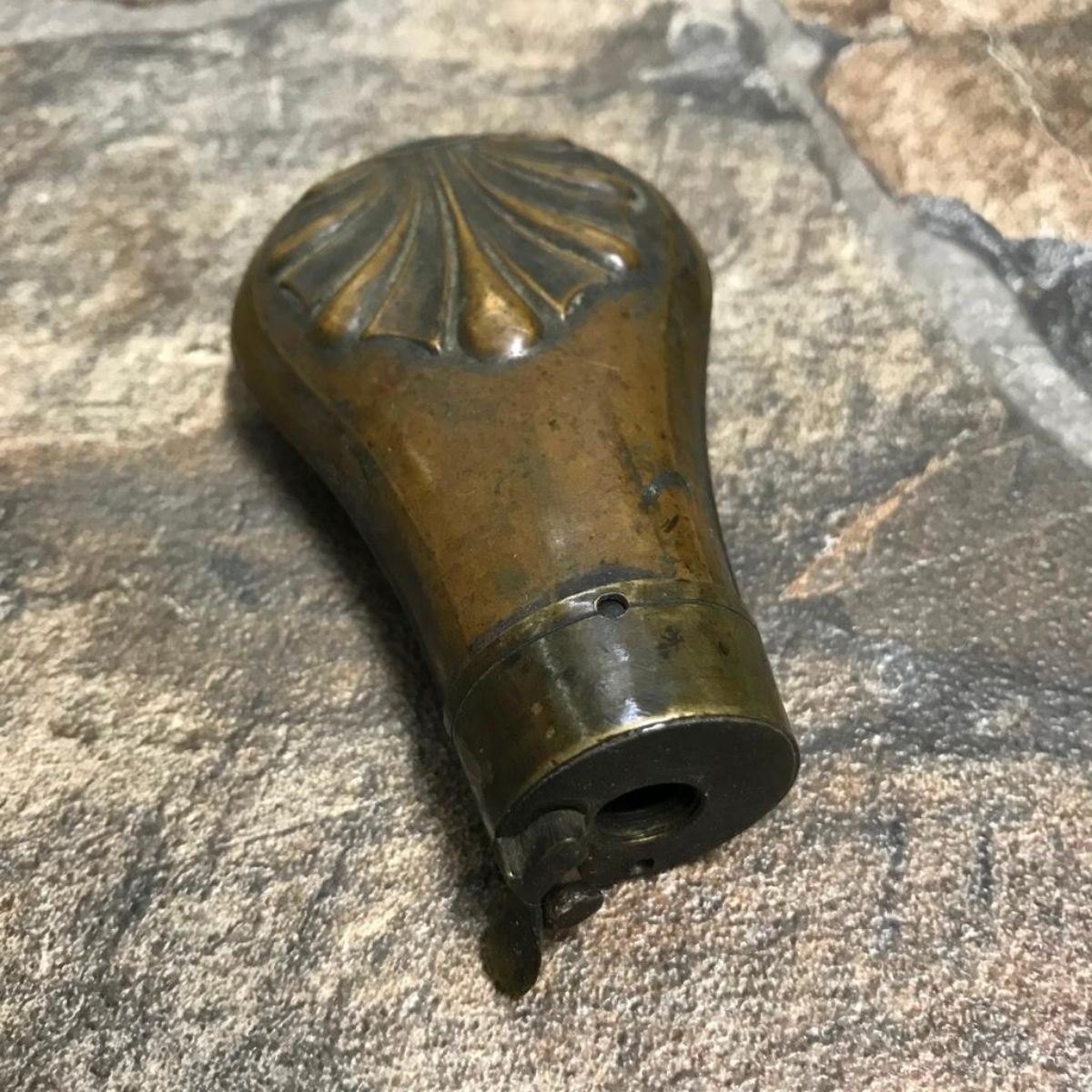 19th Century brass powder flask with ornate design. 2" W X 3 1/2" H. * missing spout, with minor denting.