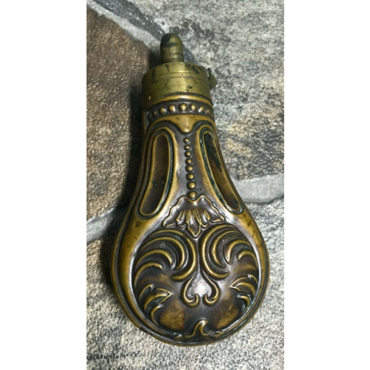 19th Century ornate copper & brass black powder flask. 4 1/2" H X 2" W. In excellent condition.Â