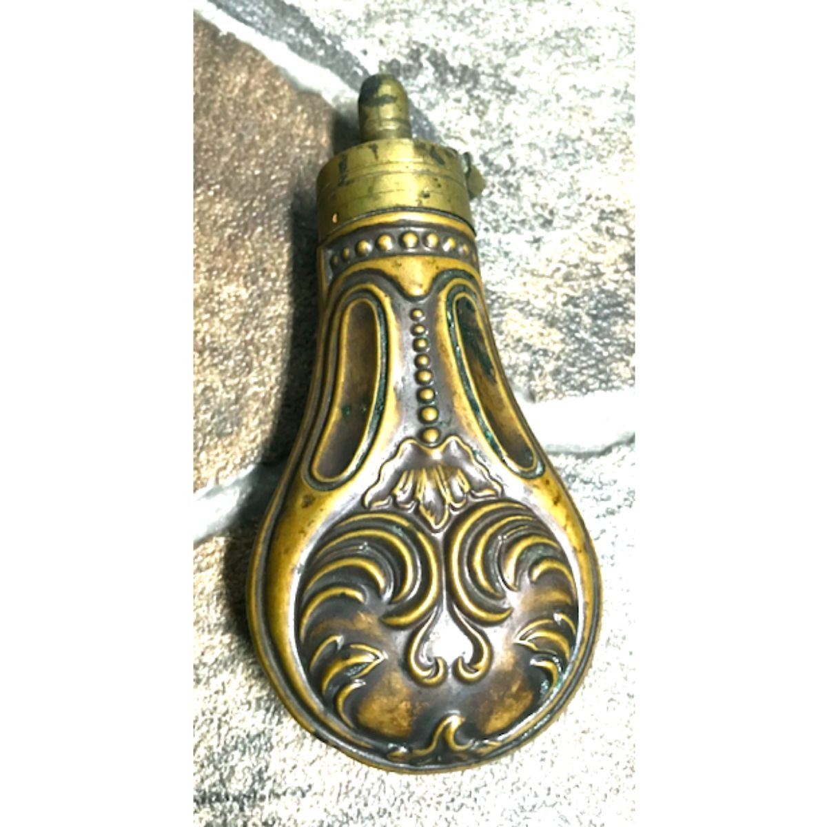 19th Century ornate copper & brass black powder flask. 4 1/2" H X 2" W. In excellent condition.Â
