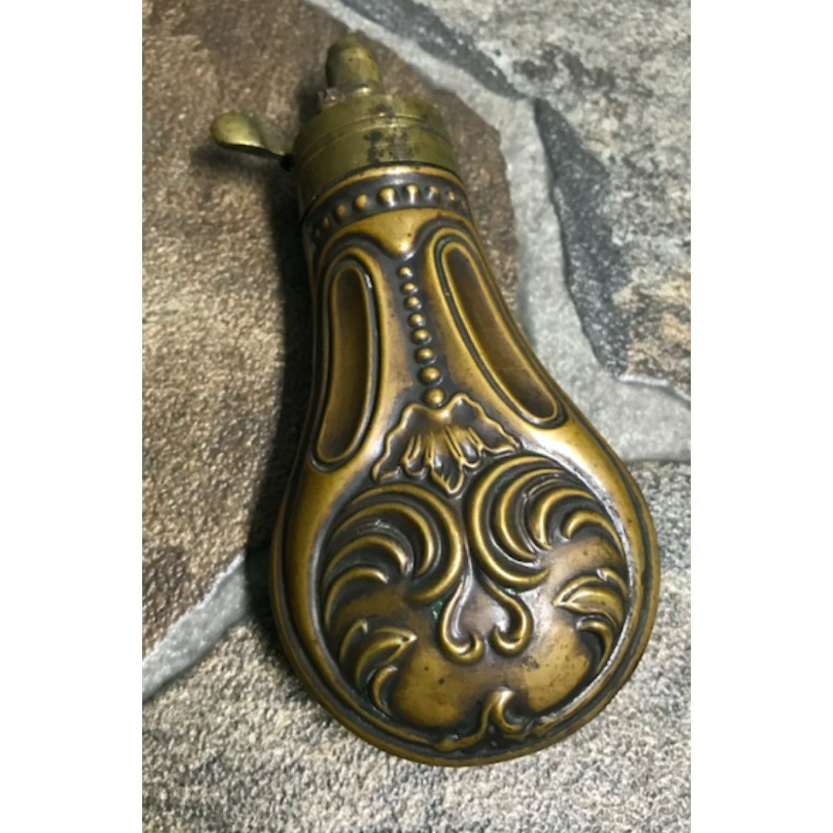 19th Century ornate copper & brass black powder flask. 4 1/2" H X 2" W. In excellent condition.Â
