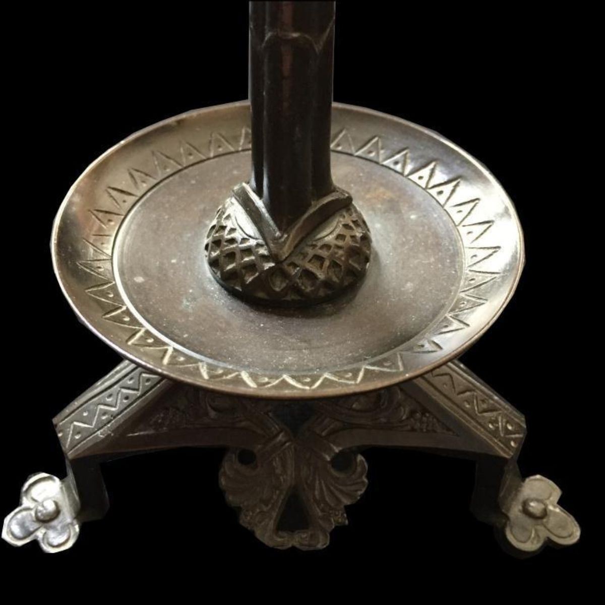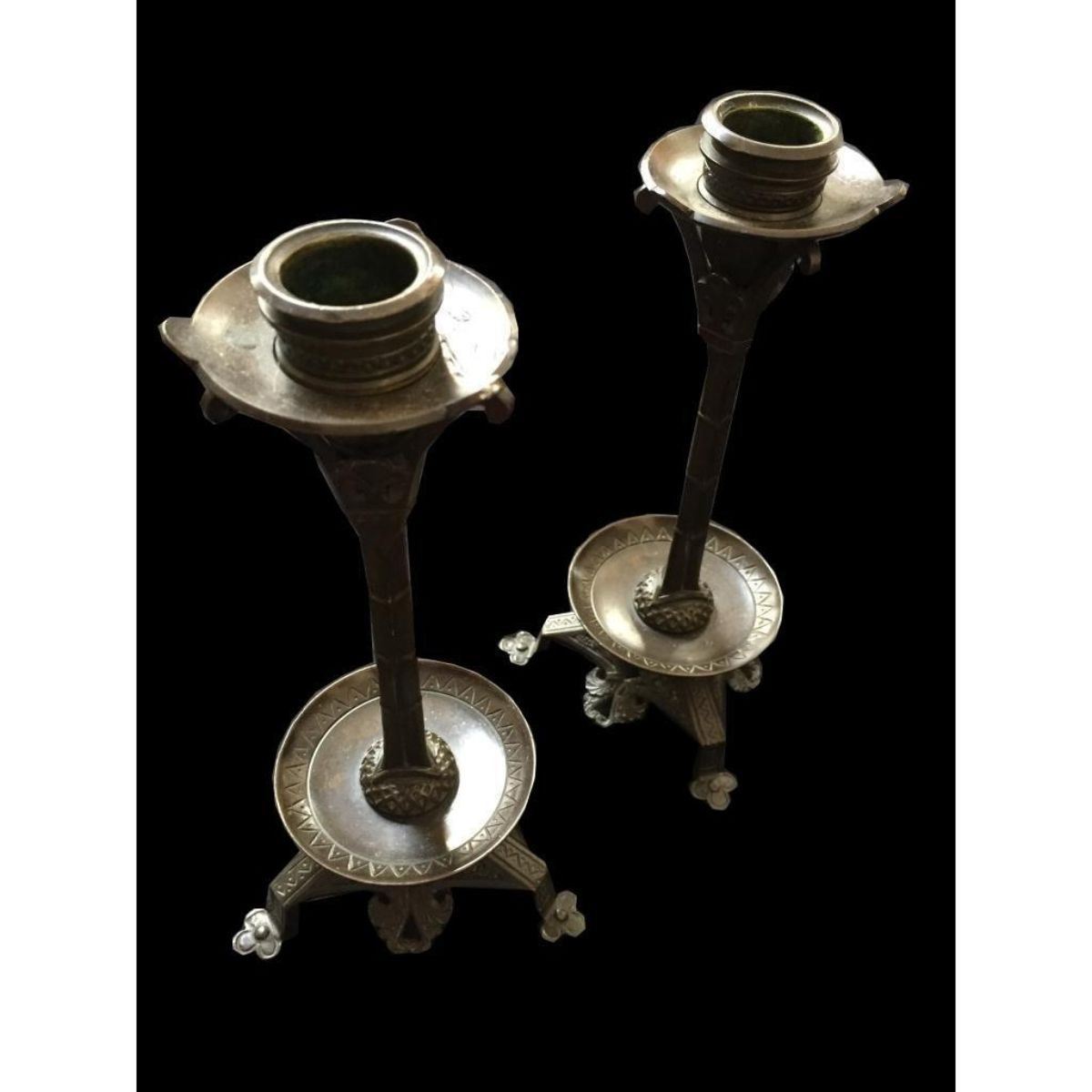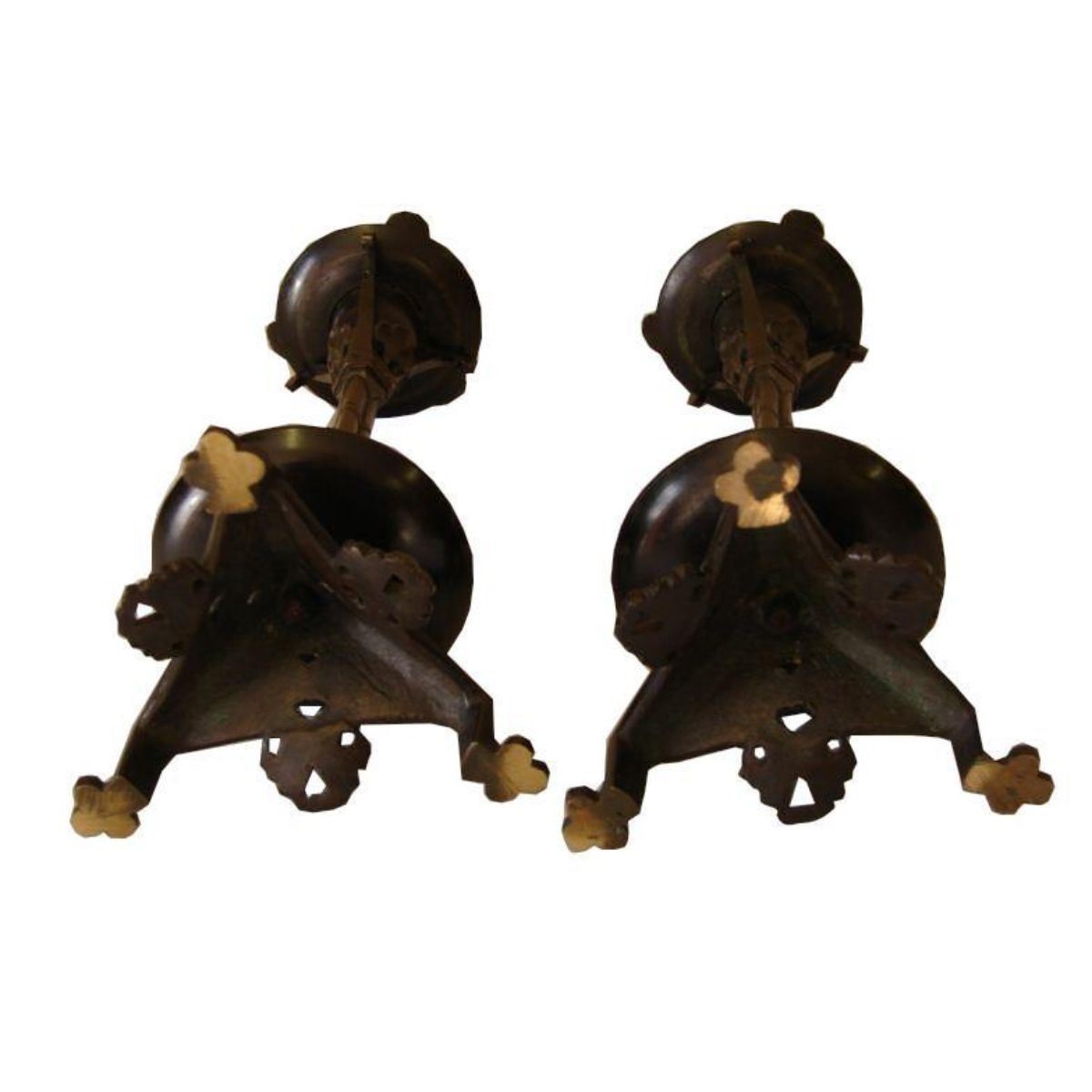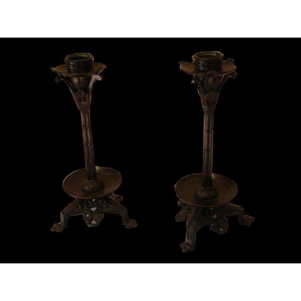 Pair of late 19th century Aesthetic-style bronze candlesticks. Highly ornate candelabra on tripod footed base. Wax drip bobeches at top & along base. 8" H X 4" W.