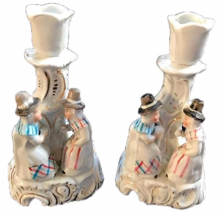19th Century German Contra Boehme porcelain fairing candle holders, in the form of two Welch ladies sharing tea, The Welch Tea Party. Â Nice colors & gold gilt still remains. 3" W X 5 1/2".