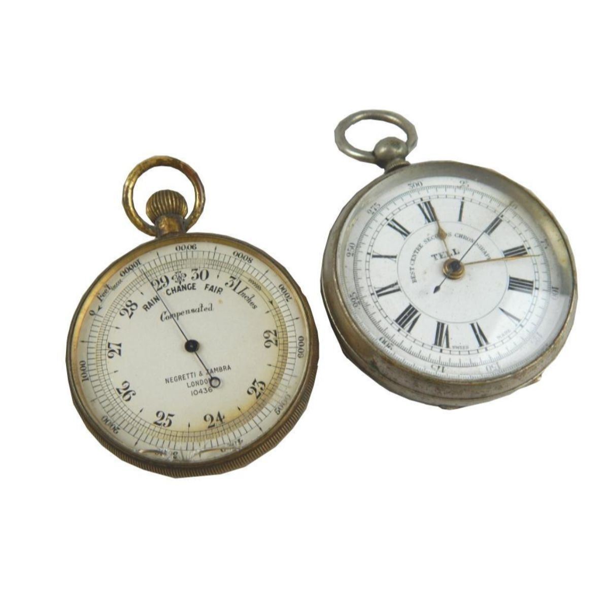 Pair of 19th Century pocket barometers. Negretti & Zambra, London & a Swiss-made, Old Sport Chronometer Chronograph. 2 3/4" - 3". in gilt metal cases.
