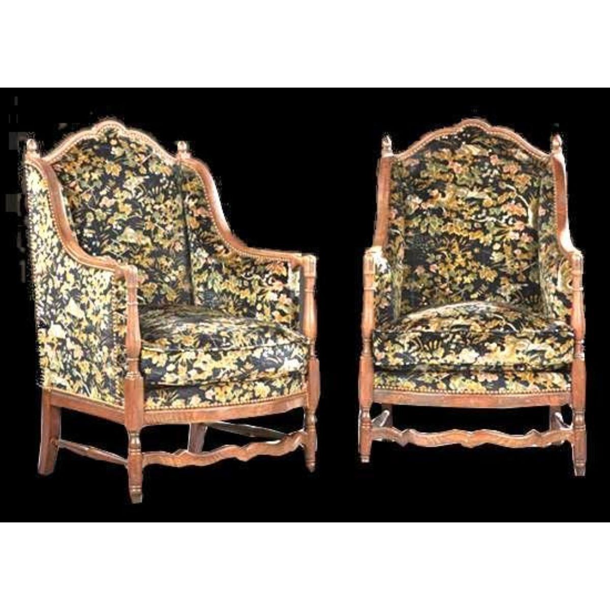 Pair of upholstered walnut diminutive wing armchairs, c. 1880, the serpentine arched crest rail flanked by finials above a bowed cushion seat, on block & turned legs, joined by serpentine stretchers, in black floral velvet upholstery with iron tack decoration, 39" H X 24" W X 21" D. -9937-032418-IN-00031
