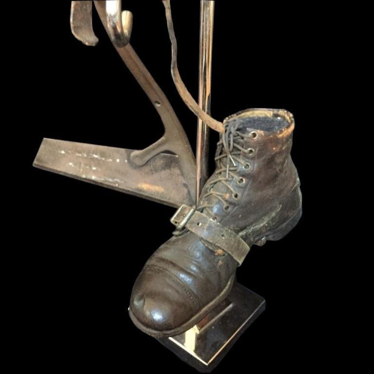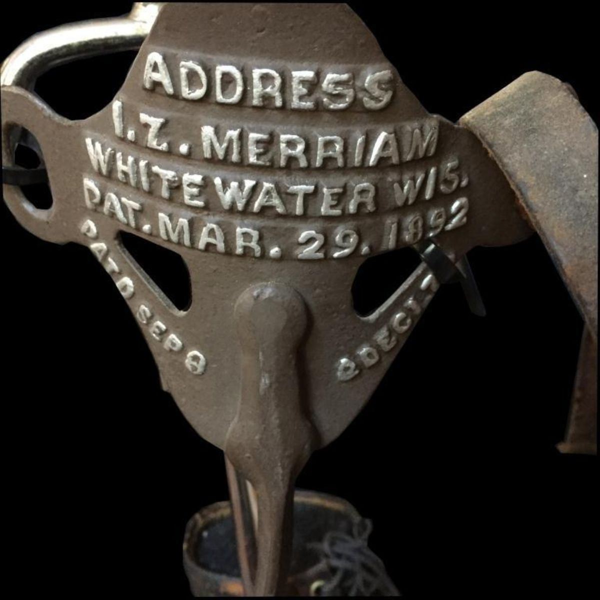 Late 19th Century Patent Model for a Sugar Cane Stalk Cutter. Printed on the cutter - "Address, I.Z. Merriam, Whitewater Wis., Pat. Mar.29. 1892." Blade attachment is 18" L X 7" W with leather strap & attached leather shoe/ boot. With metal stand. Wonderful display piece from a South Carolina museum.