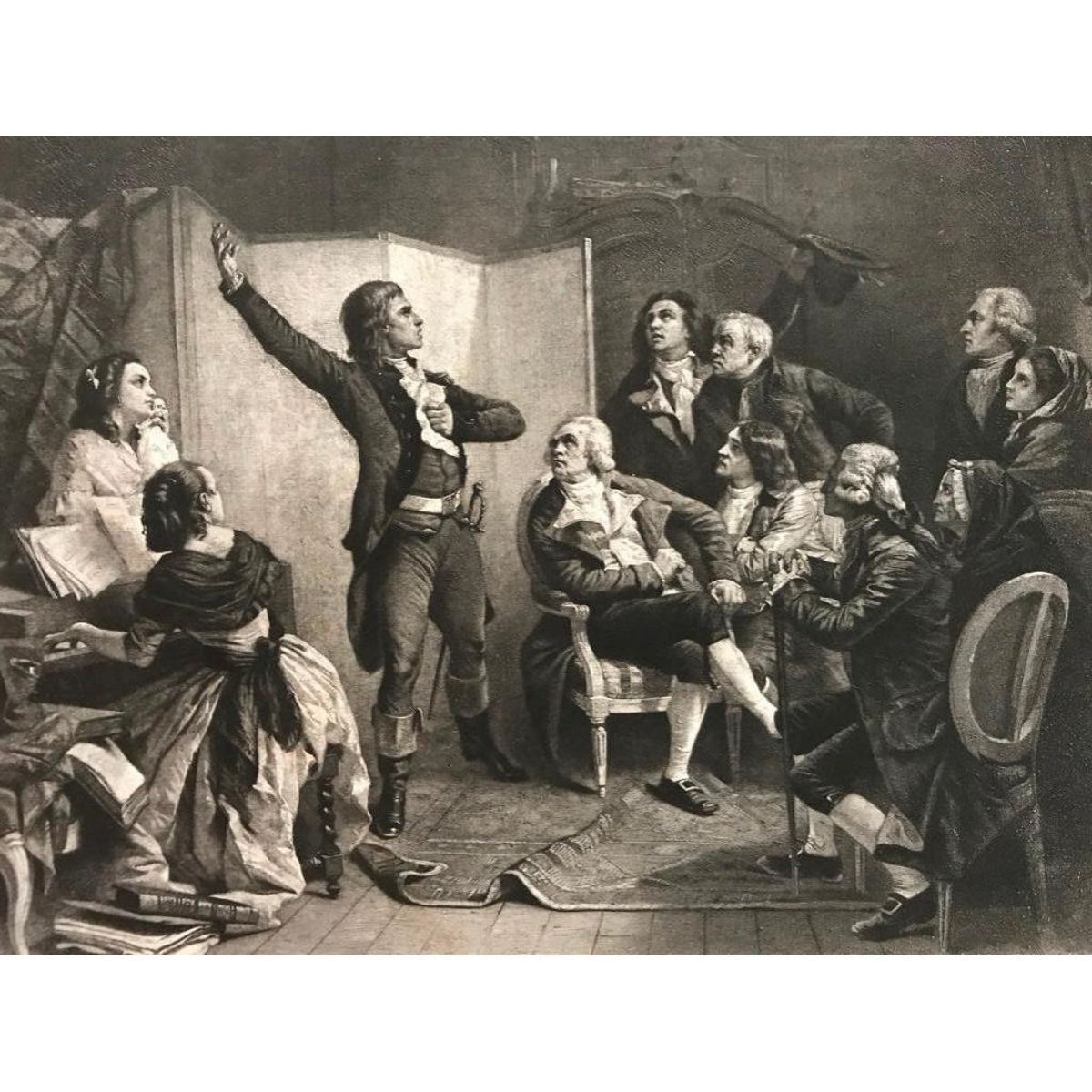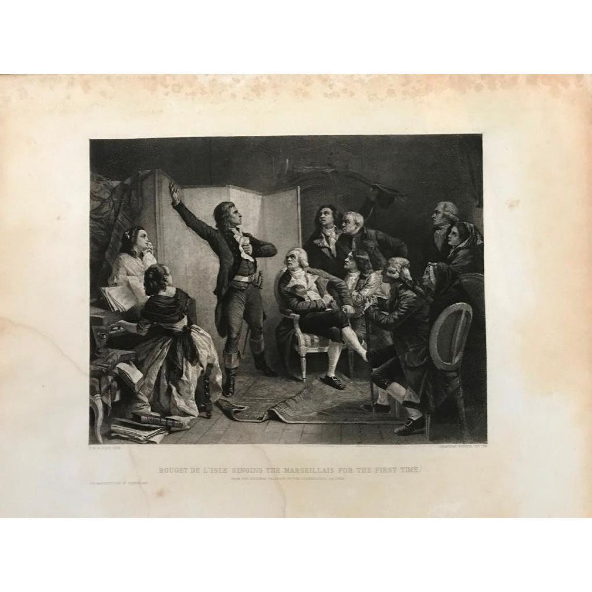 19th Century photogravure print Rouget D L'Isle Singing The Marseillais For The First Time ( a scene of The French Revolution, The French National Anthem ) from an Imperial Edition of The Masterpieces of French Art published in the 1880's by Goupil et Cie, after the original painting in the Luxembourg Gallery by J.A.A. Pils. 10 1/2" X 14 1/2". * some foxing & staining, per photos. "La Marseillaise", the national anthem of France was written in 1792 by Claude Joseph Rouget de Lisle in Strasbourg after the declaration of war by France against Austria, and was originally titled "Chant de guerre pour l'Armee du Rhin". Â