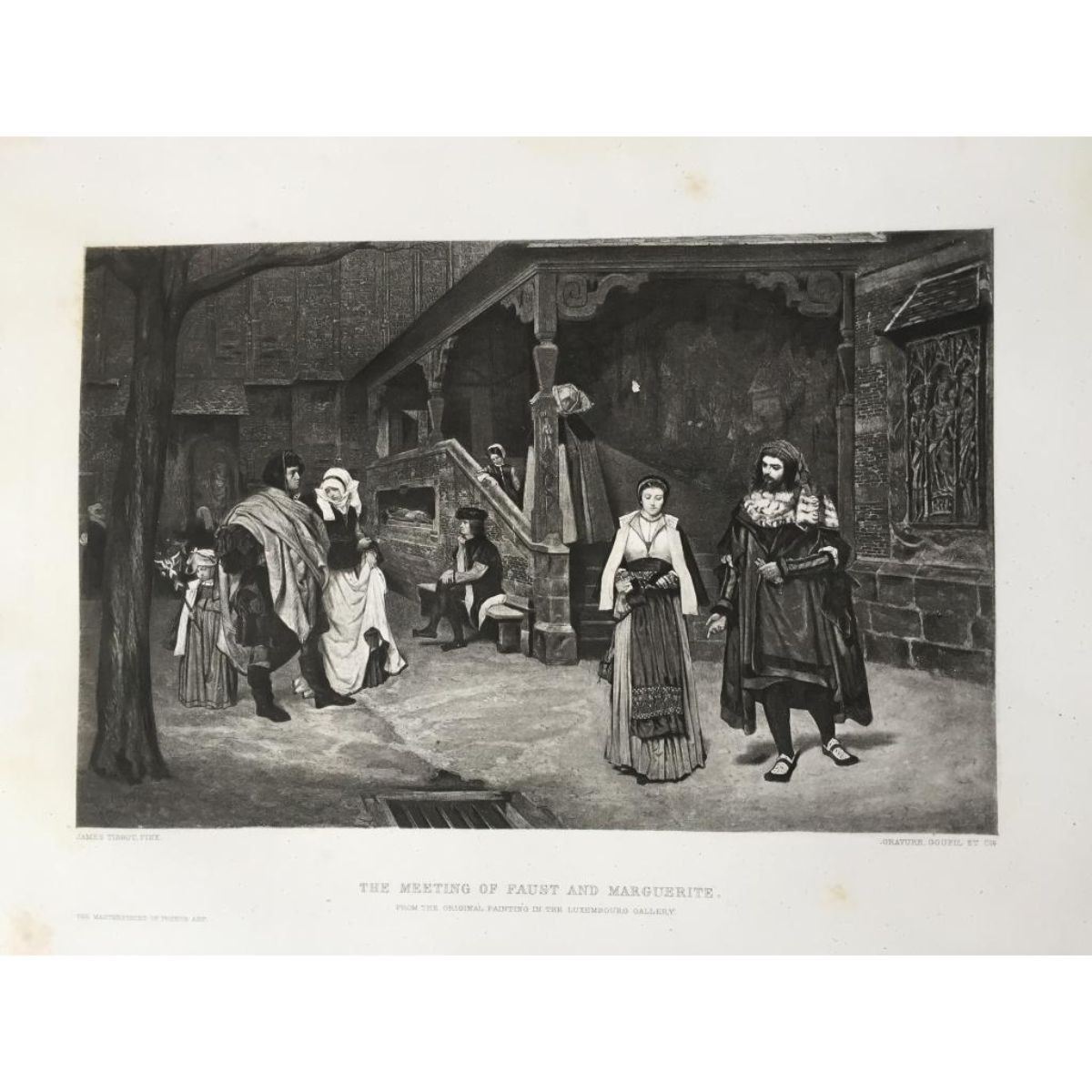 Original 1880's photogravure print, from an 1883 Imperial, limited edition of 1000, "The Masterpieces of French Art." Goupil & Co. engravers, Paris. Printed on heavy Japon paper. From the original painting by JamesTibbot, "The Meeting of Faust & Marguerite." Comes with original descriptive divider page. 10" X 14". Slight foxing around margins.