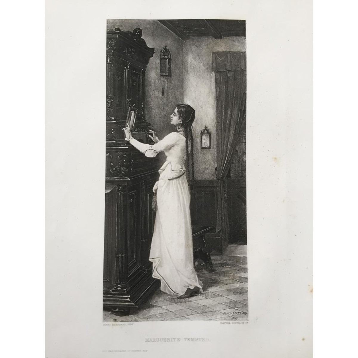 Original 1880's photogravure print, from "The Masterpieces of French Art", Imperial limited edition of 1000, by Goupil & Co., printed on Japon paper. From the original painting by James Bertrand. The scene -Goethe, in his masterpiece of "Faust" shows the temptation of jewels placed in Marguerite's chamber. Comes with original descriptive divider page. 10" X 14". * minor foxing along border.