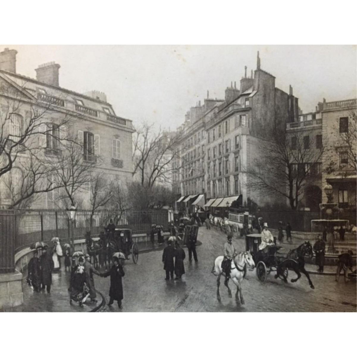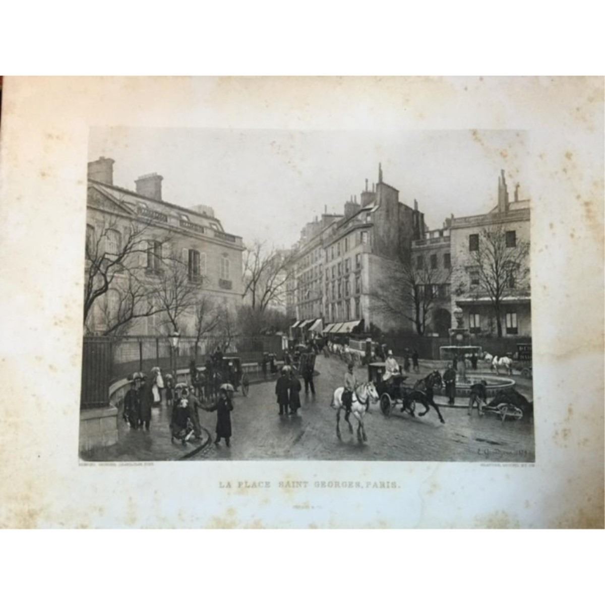 Original 1883 folio photogravure of "La Place Saint Georges, Paris." 1879 by artist Edmond Georges Grandjean, Pinx. Gravure, Goupel et Cie. Taken from "Masterpieces of French Art". Lovely scene of daily life (couples strolling with umbrellas on a rainy day in Paris, with horses & carriages. Life during the Belle Epoque. Comes with the original introduction page that sets the scene as a walk from from the Opera Houseacross the Boulevard des Italiens to reach this scene. 11" X 14" Scattered foxing & a water stain to the bottom right that seems to blend with the foxing.