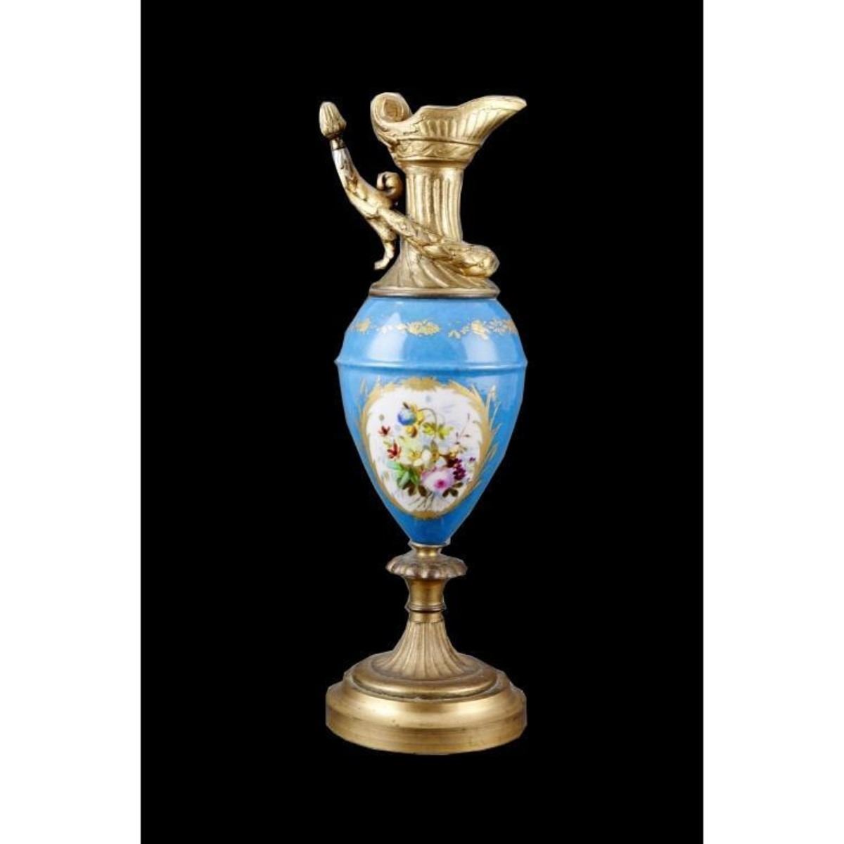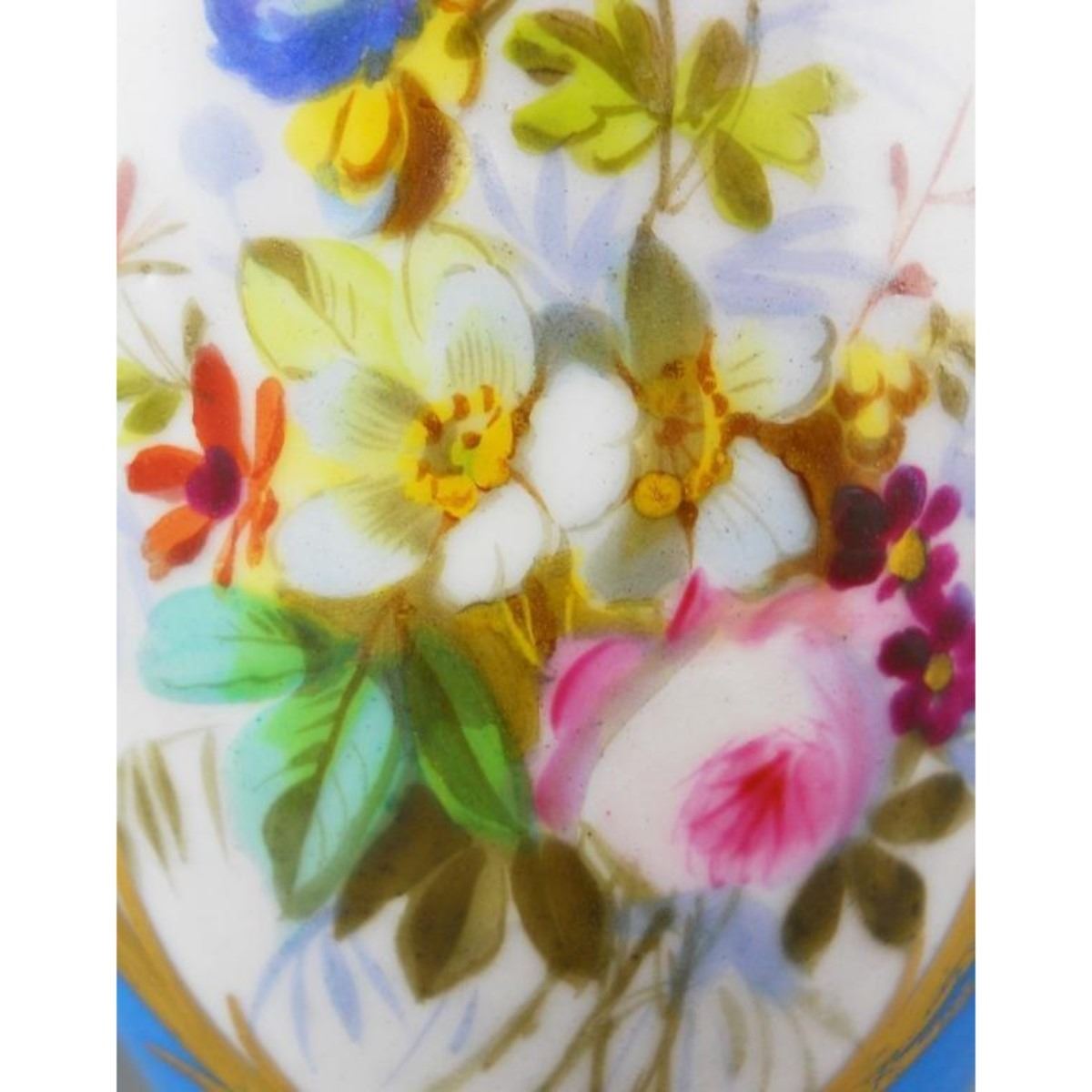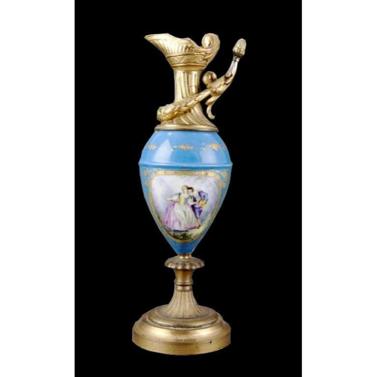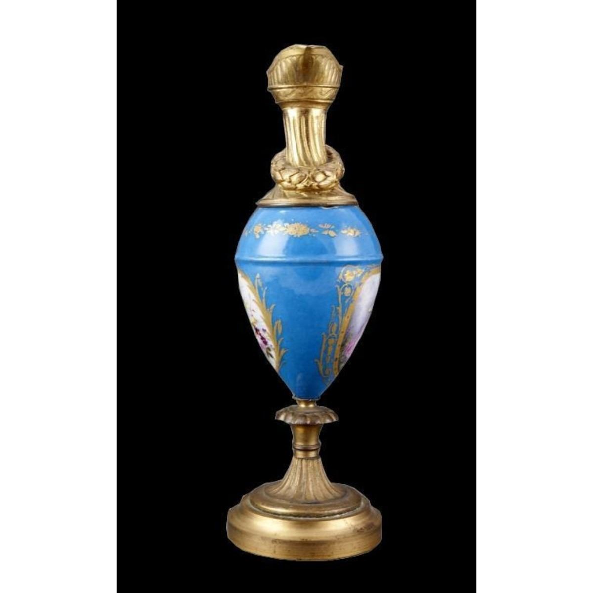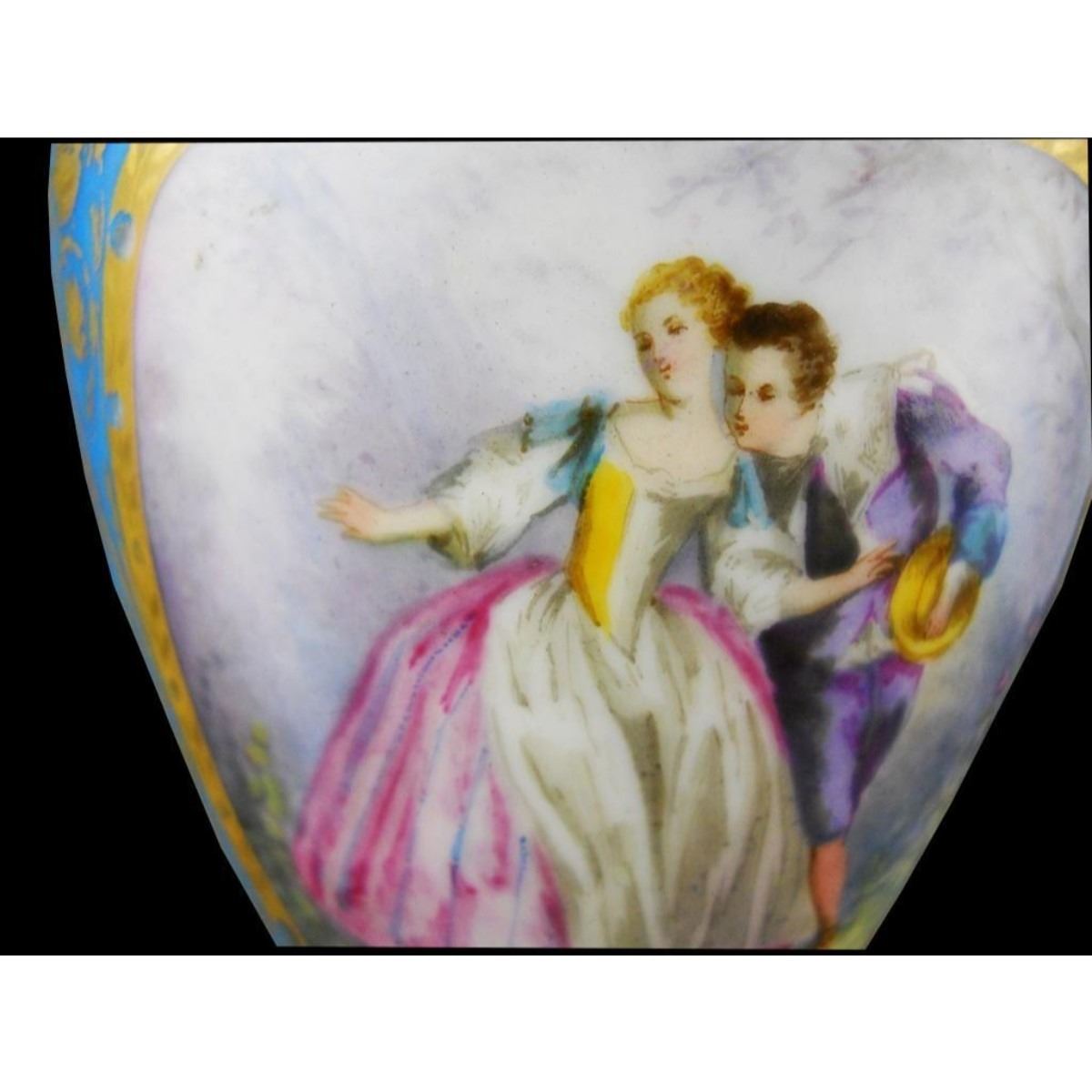 19th century hand-painted Sevres-style, gilt bronze porcelainized urn, with scenes depicting young lovers on one side & florals on the reverse. 11 1/2" H. 4" D bottom.