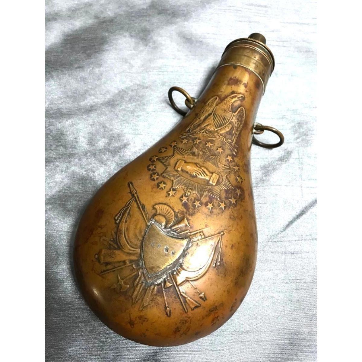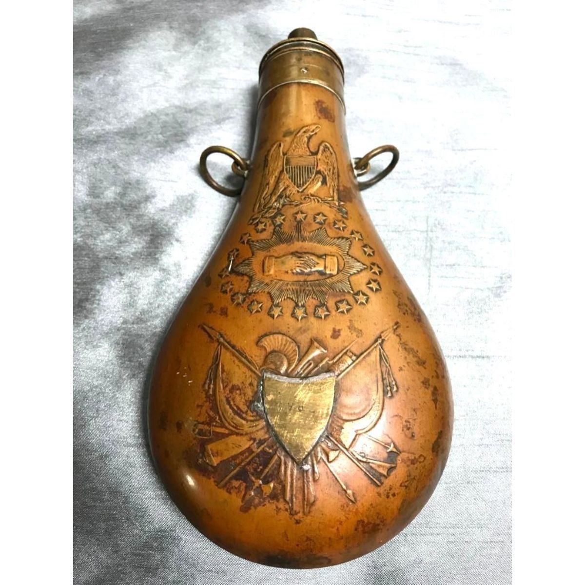 19thc embossed brass shot flask with patriotic emblems, ( de-unionized, possibly C.S.A.).
