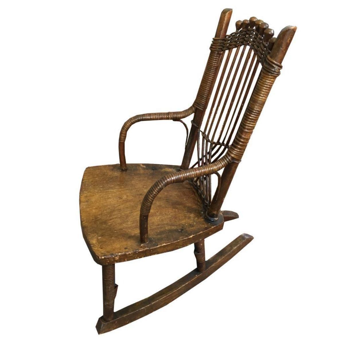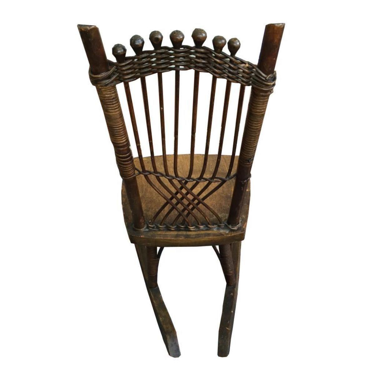 Early primitive, 19th-century wood & woven cane backed child's rocking chair. Hand-crafted in the North Georgia Blue Ridge Mountains by a skilled artisan. 23" H X 18" L including rocker legs,12" W at widest point.