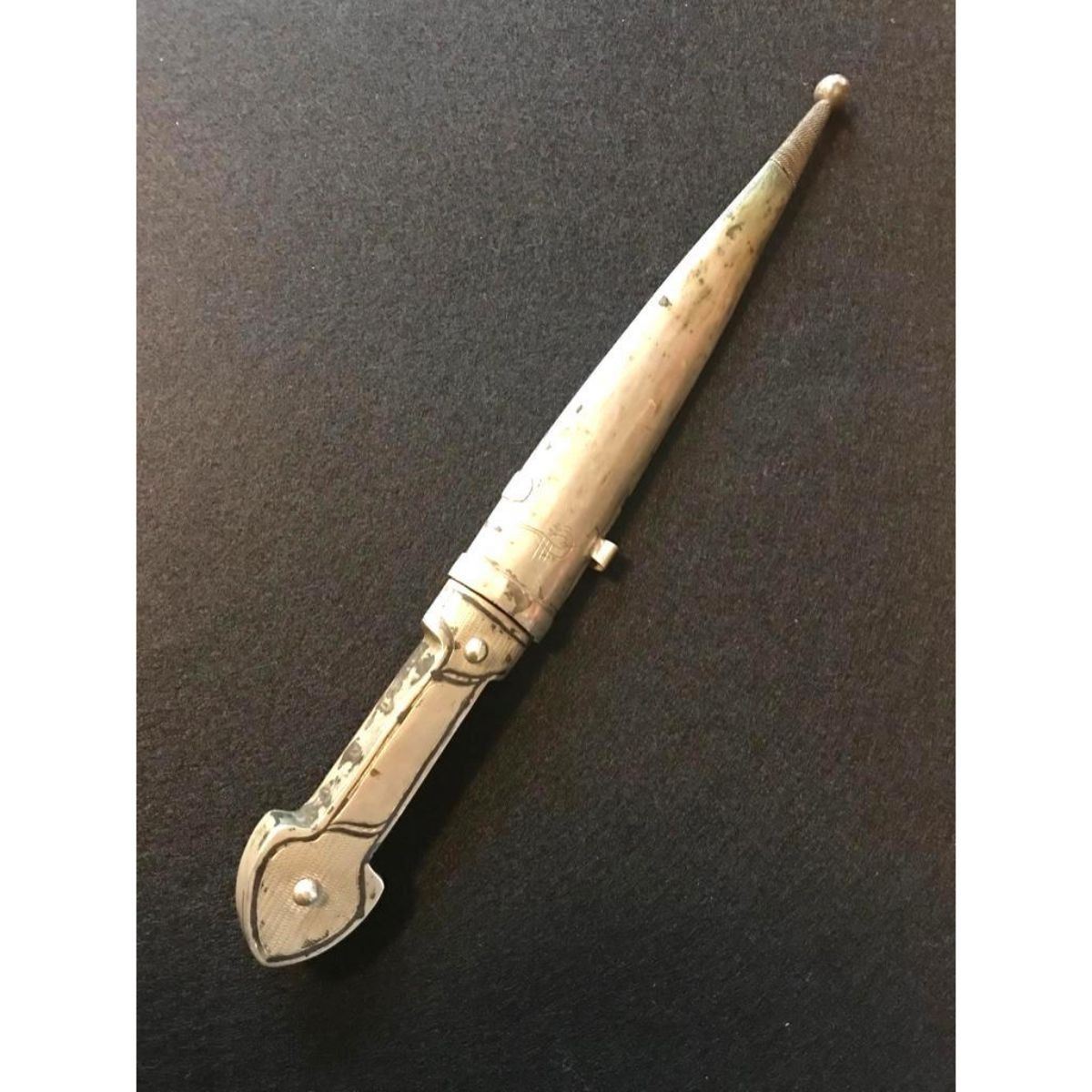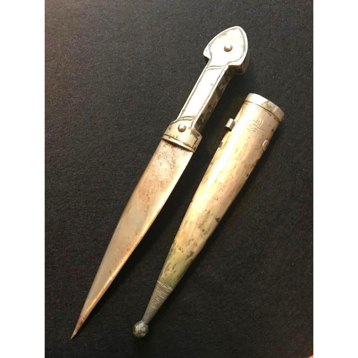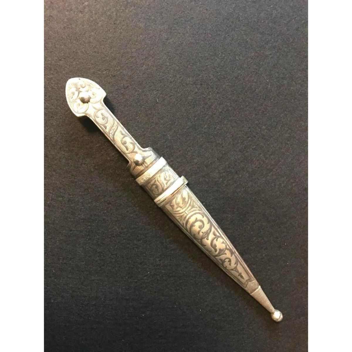 19th Century Russian Imperial Niello silver Kindjal Dagger. 5 1/2" blade.11" overall length. Handle & scabbard made of silver. The blade is made of a strong metal ( not silver ). Inside the scabbard you can see the old antique wooden walls, which protect the scabbard against the blade. Hallmarked on the reverse side of the scabbard. *** Niello - black metallic alloy of sulfur with silver, copper, or lead that is used to fill designs that have been engraved on the surface of a metal object. Niello is made by fusing together silver, copper, and lead and then mixing the molten alloy with sulfur. The resulting black-colored sulfides are powdered, and after the engraved metal, usually silver, has been moistened with a flux, some of the powder is spread on it and the metal strongly heated; the niello melts and runs into the engraved channels. The excess niello is then removed by scraping until the filled channels are clearly visible, & finally the surface is polished. The contrast of the black niello against the bright silver surface produces an attractive decorative effect