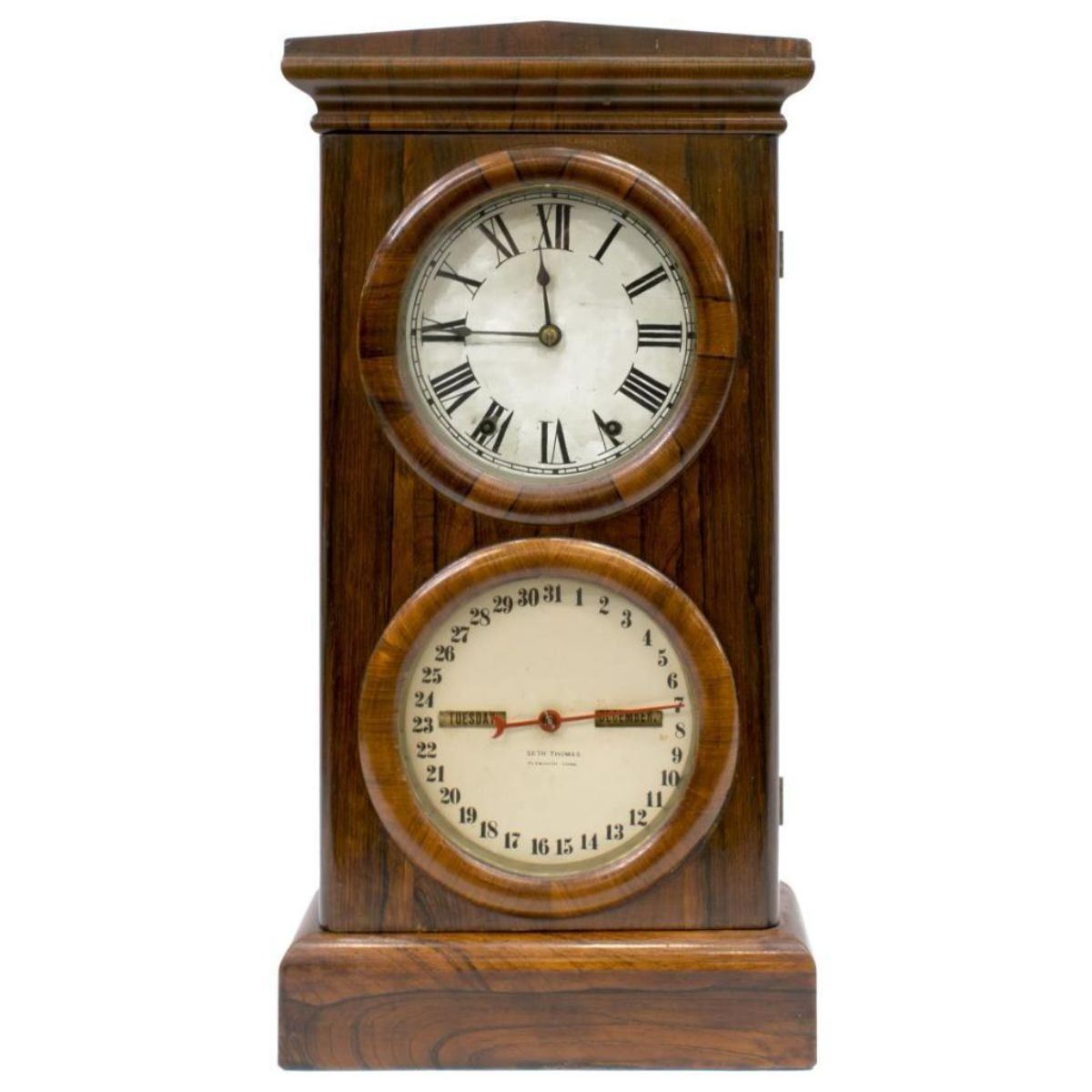 Seth Thomas perpetual calendar clock, 19th c., housed in a rosewood case, the clock face with Roman numerals above the calendar dial, clock observed operating for fifteen minutes, 27" H X 14" W, 4 3/4" D. 13.5lbs. - 9231_021718-IN-332