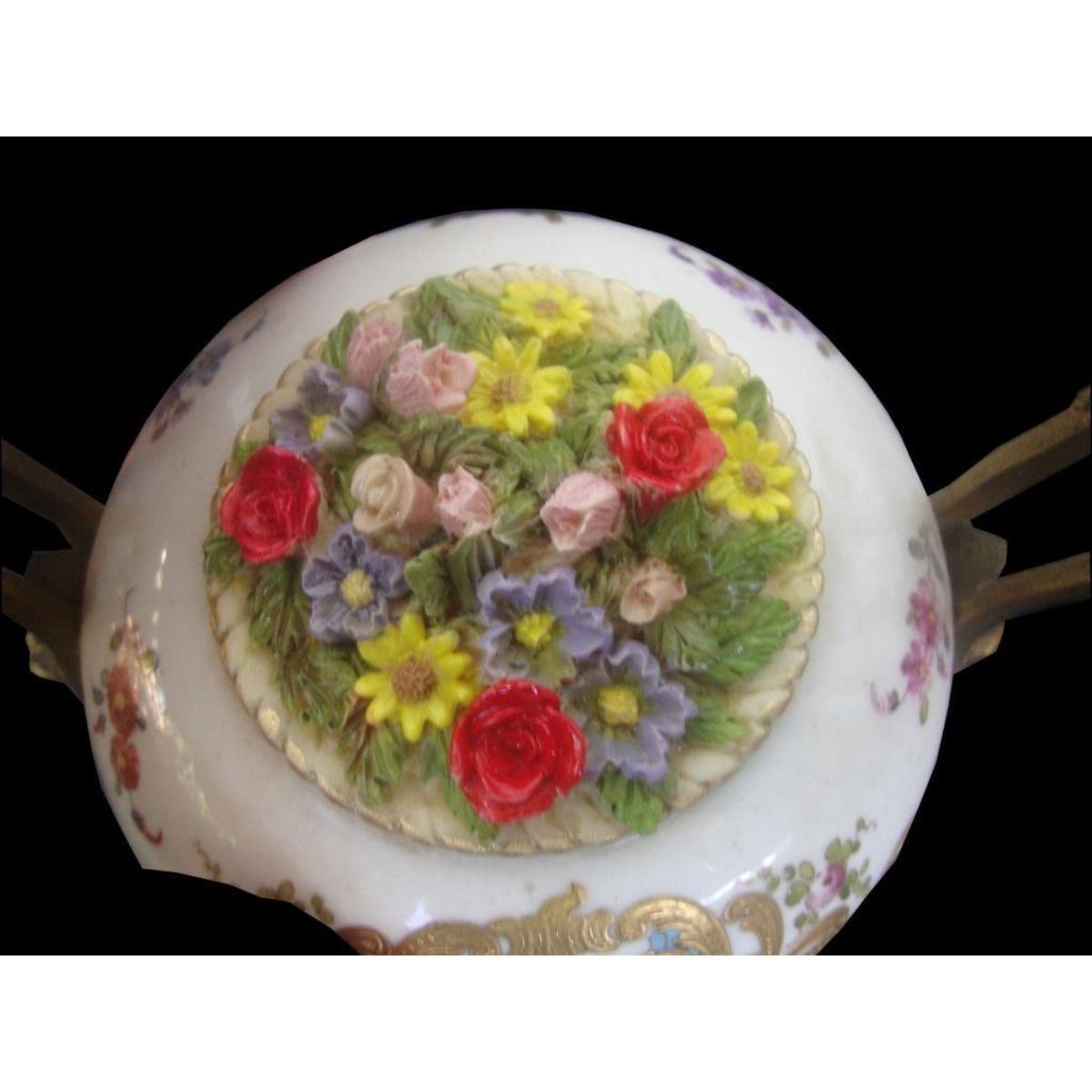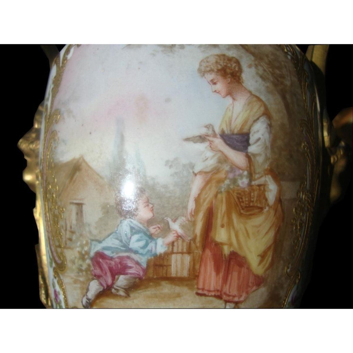 19thc Sevres porcelain & gilt bronze handled urn. Front cartouche featuring peasant woman & child. Back cartouche features a castle by a lake. Ornate cherub face gilt bronze handles & ornate gilt bronze base. Ornatemulti colored flower garden top. Sevres blue crossed L's mark inside base. *one handle is slightly loose & needs to be tightened. 13" X 7" X 5".