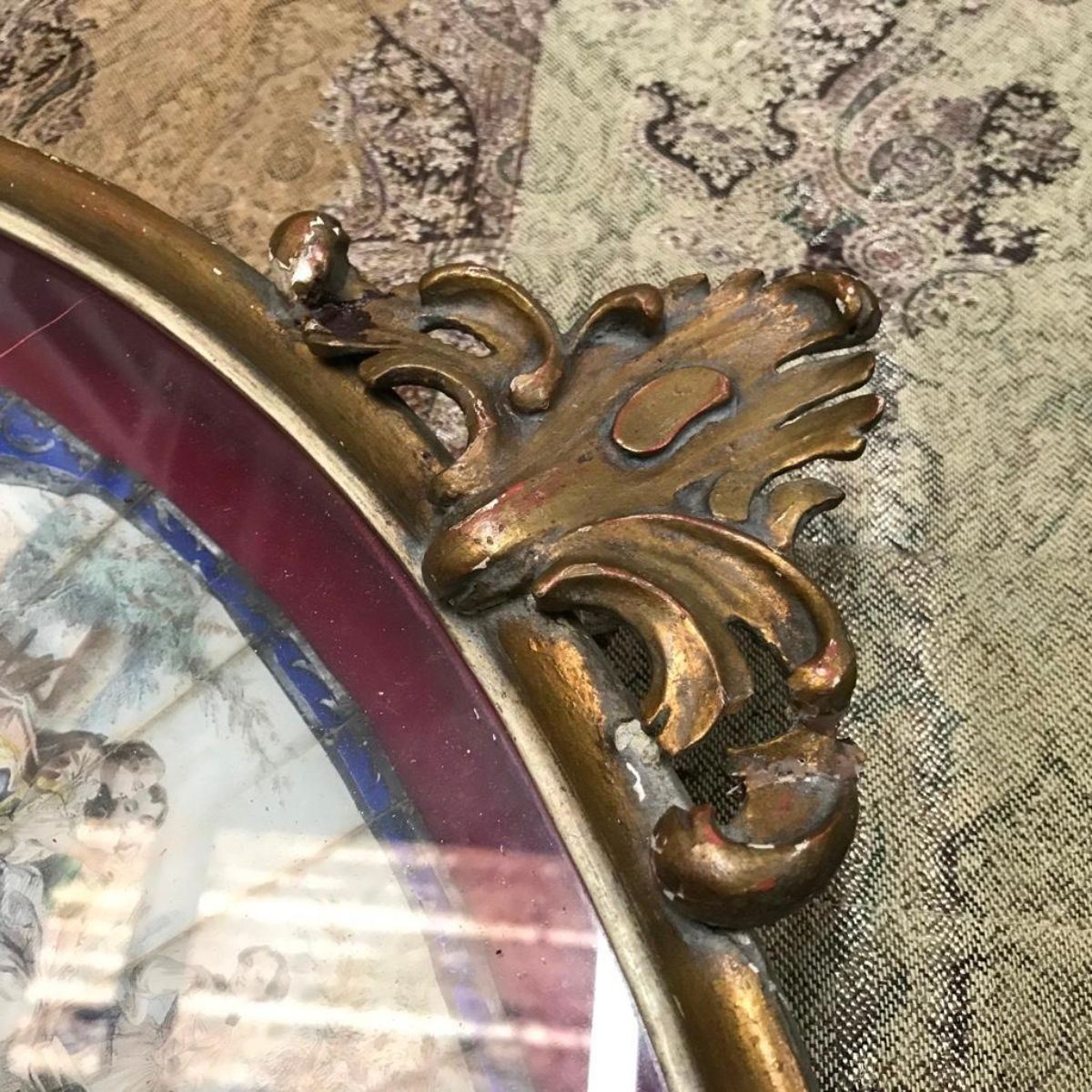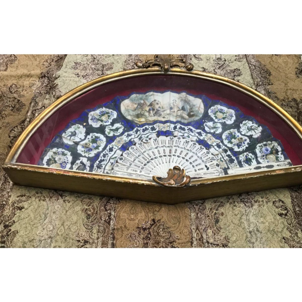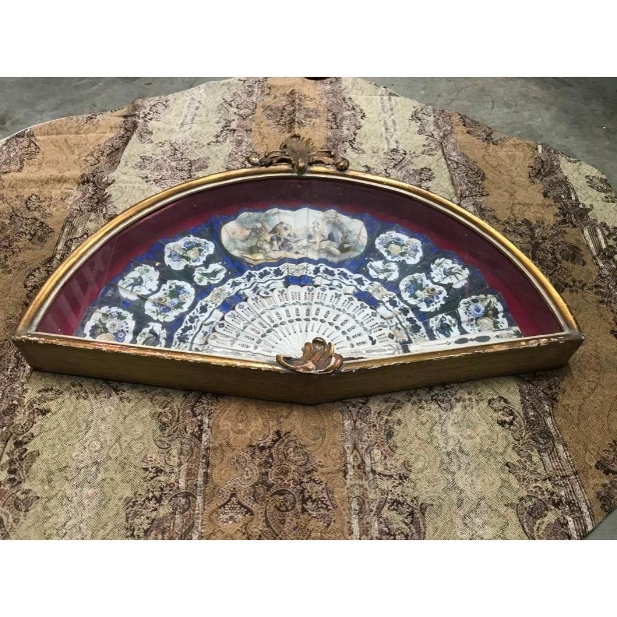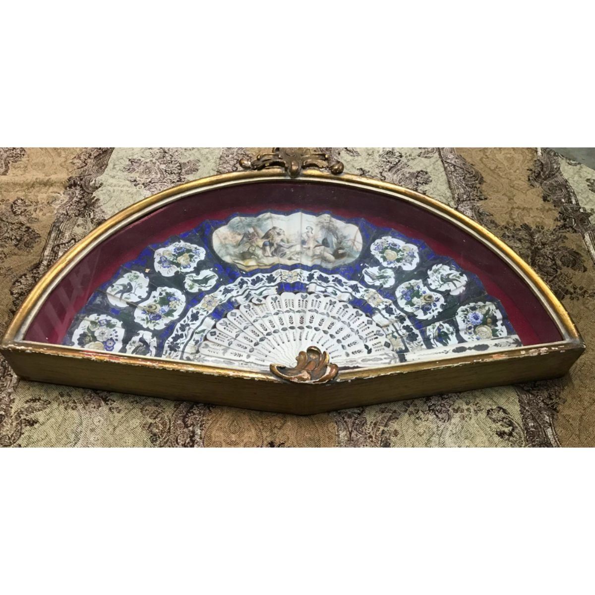 19th-century courting scene hand fan presented in period gilt shadowbox frame. 23" W X 16" H X 2 1/4" D. * older repair to top ornament of frame.