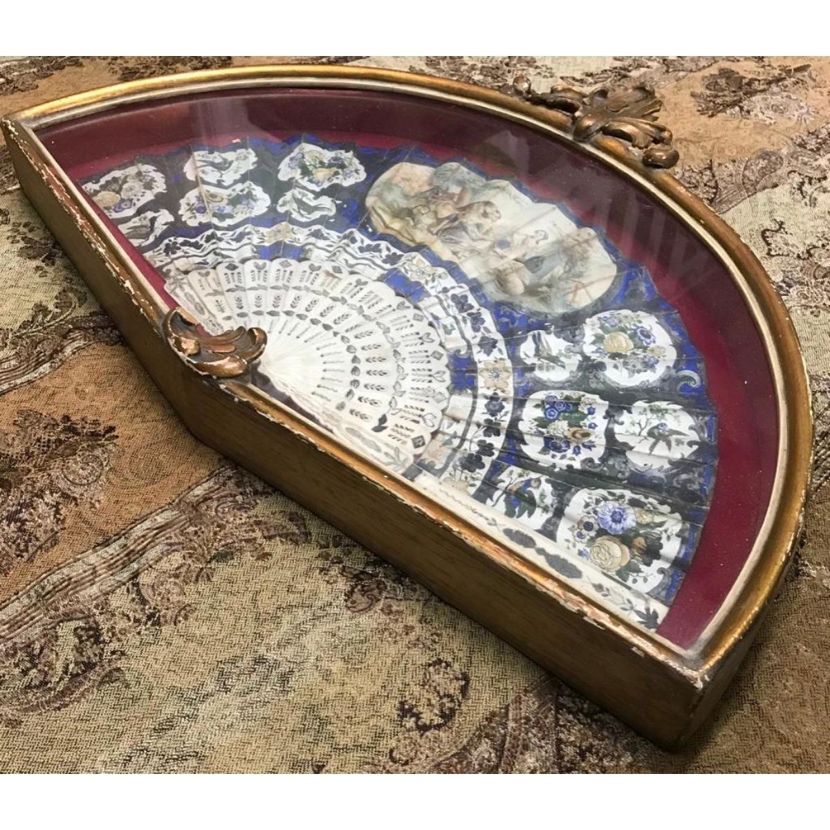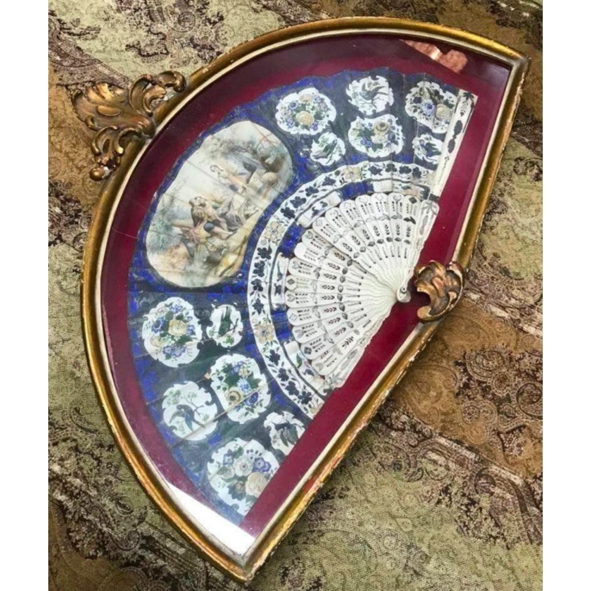 19th-century courting scene hand fan presented in period gilt shadowbox frame. 23" W X 16" H X 2 1/4" D. * older repair to top ornament of frame.