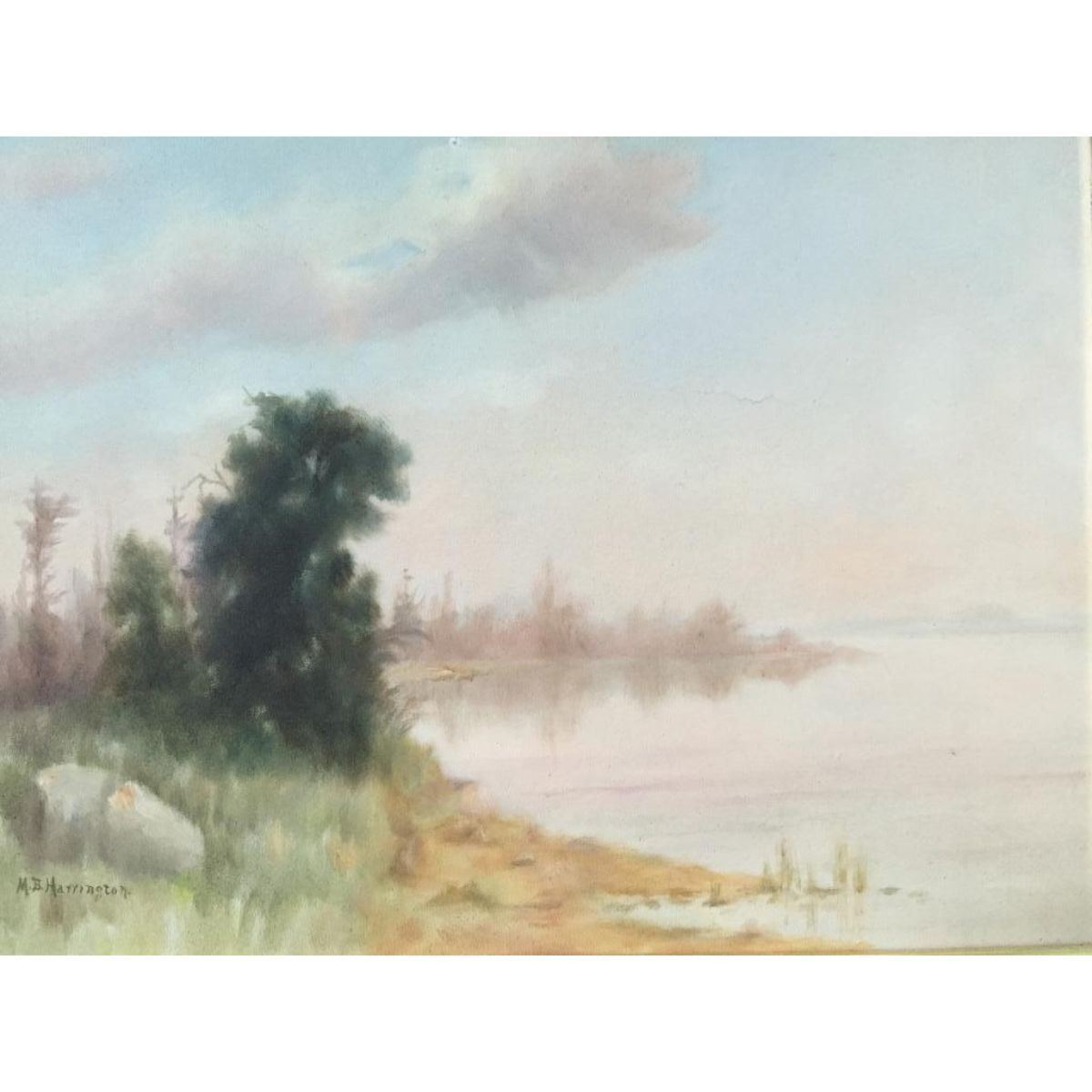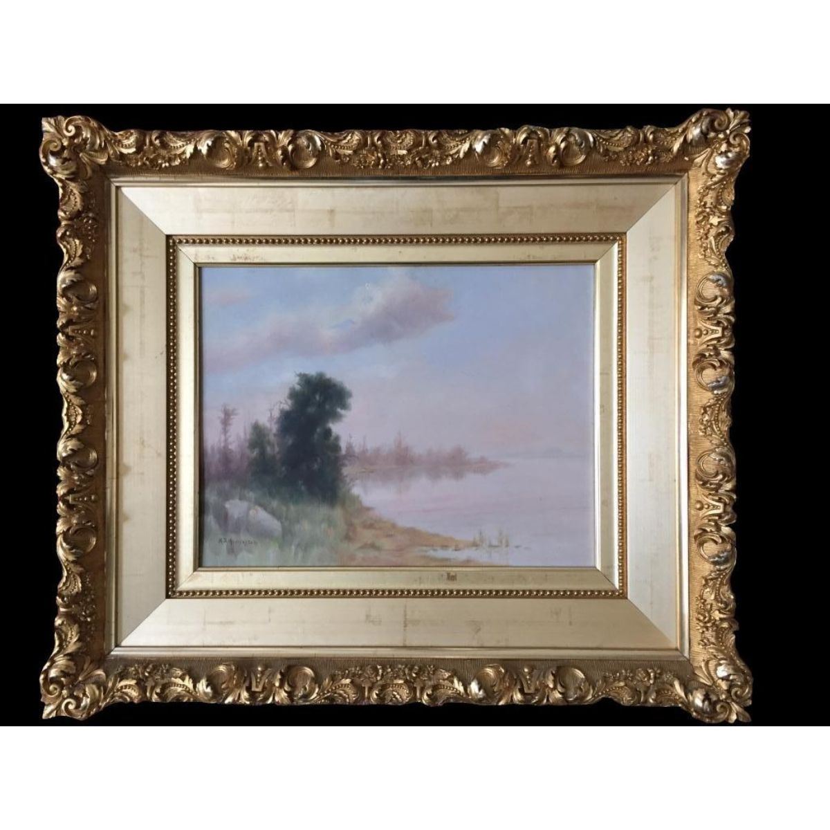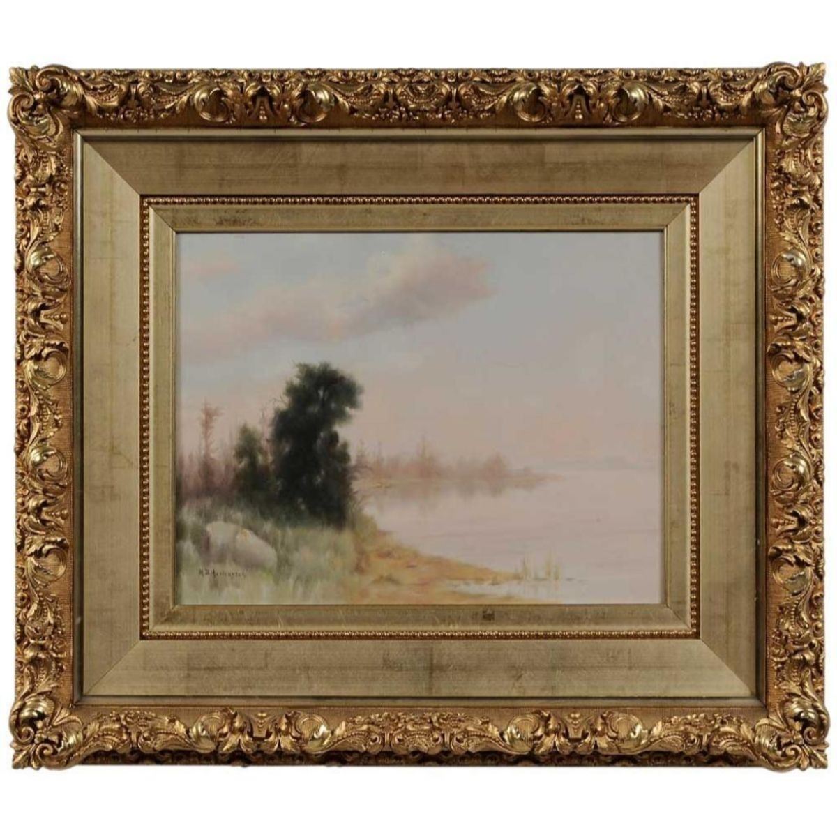 Minnie B. Harrington ( American, late 19th / early 20th century ) "Fisher's Bay". Landscape painting. Signed lower left "M.B. Harrington", oil on artist board, 11 5/8" X 15 "; in original ornate gilt wood &