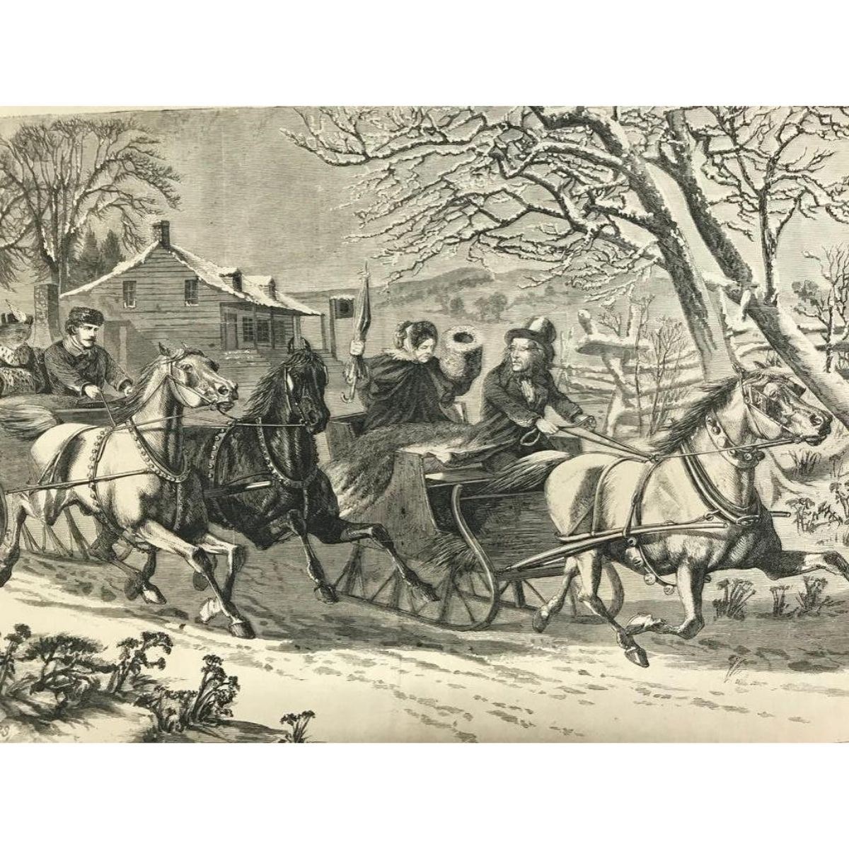 Sleighing Scene In The Country - "Blood Will Tell" wood cut engraving from a Civil War era ( Feb 11, 1865 ) edition of Frank Leslie's Illustrated Newspaper. Approx 9 1/2" X 14 1/2".Â