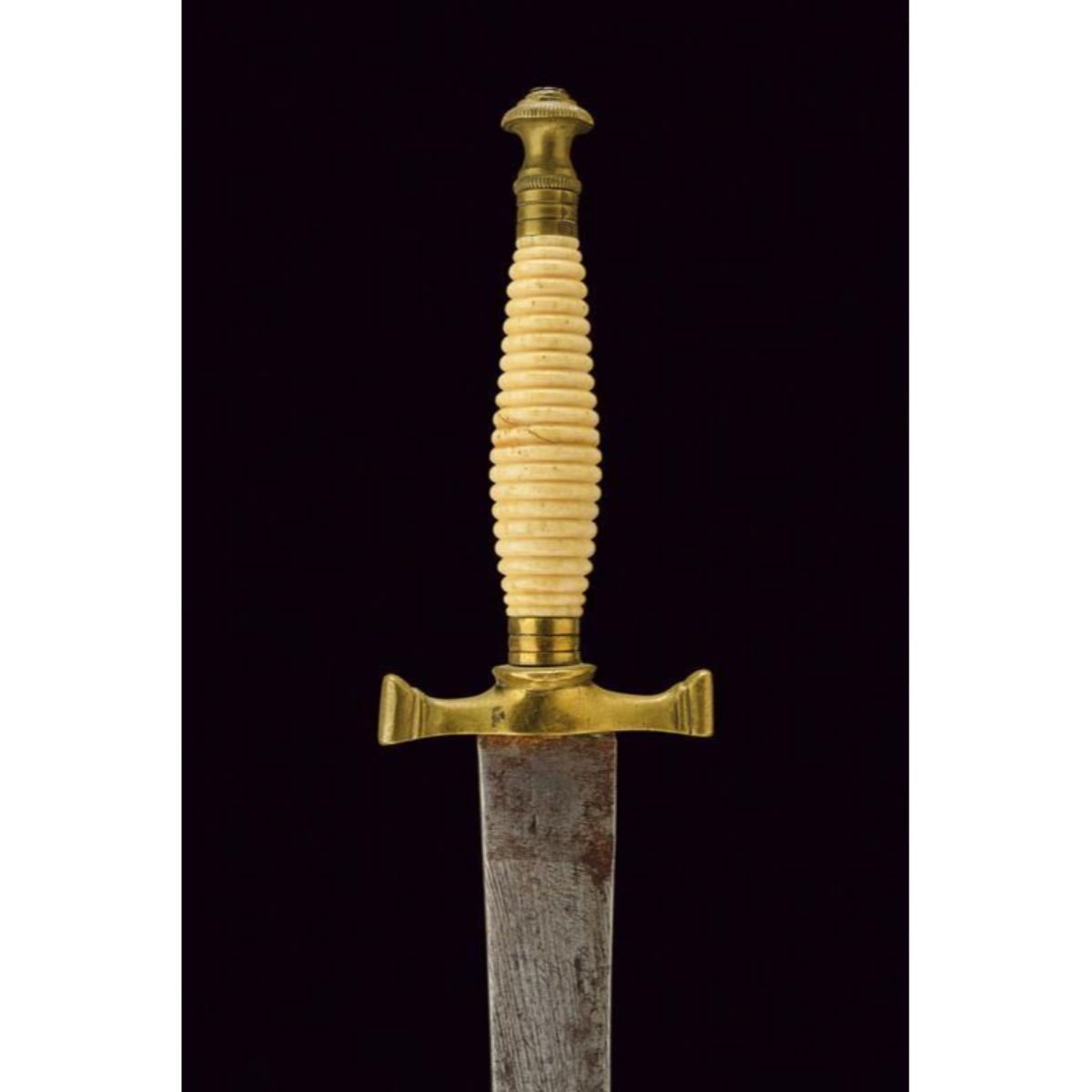 19thc Spanish blade with sheath. Daga Da Cadetto, straight blade without wires, of flat section; brass hoist numbered "61", handle in bone worked with anellatura ( restoration in the center ), brass cap. Metal sheath with brass fittings. 21 1/2" L ( 54.5 cm ). 10124-040518-CZ-00463