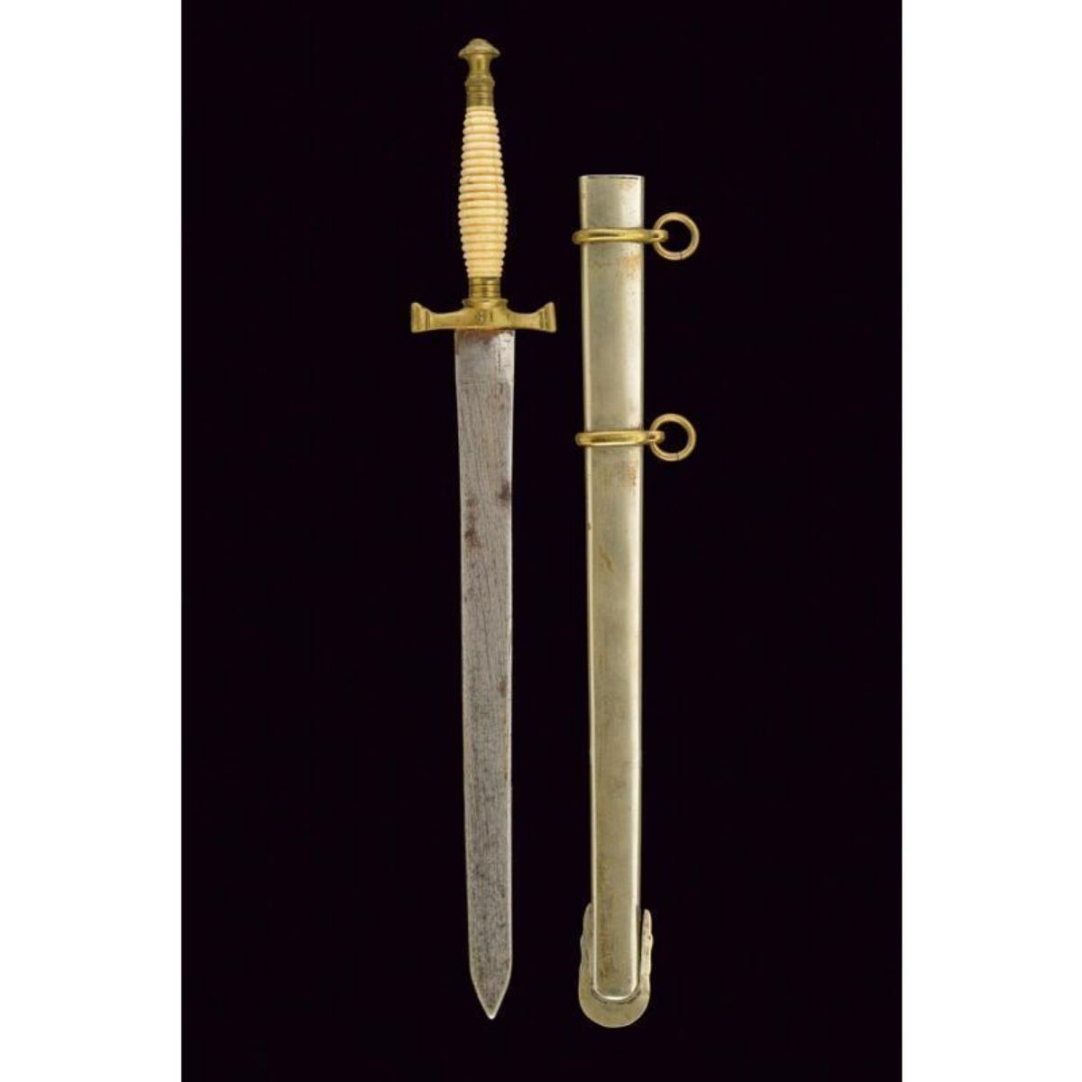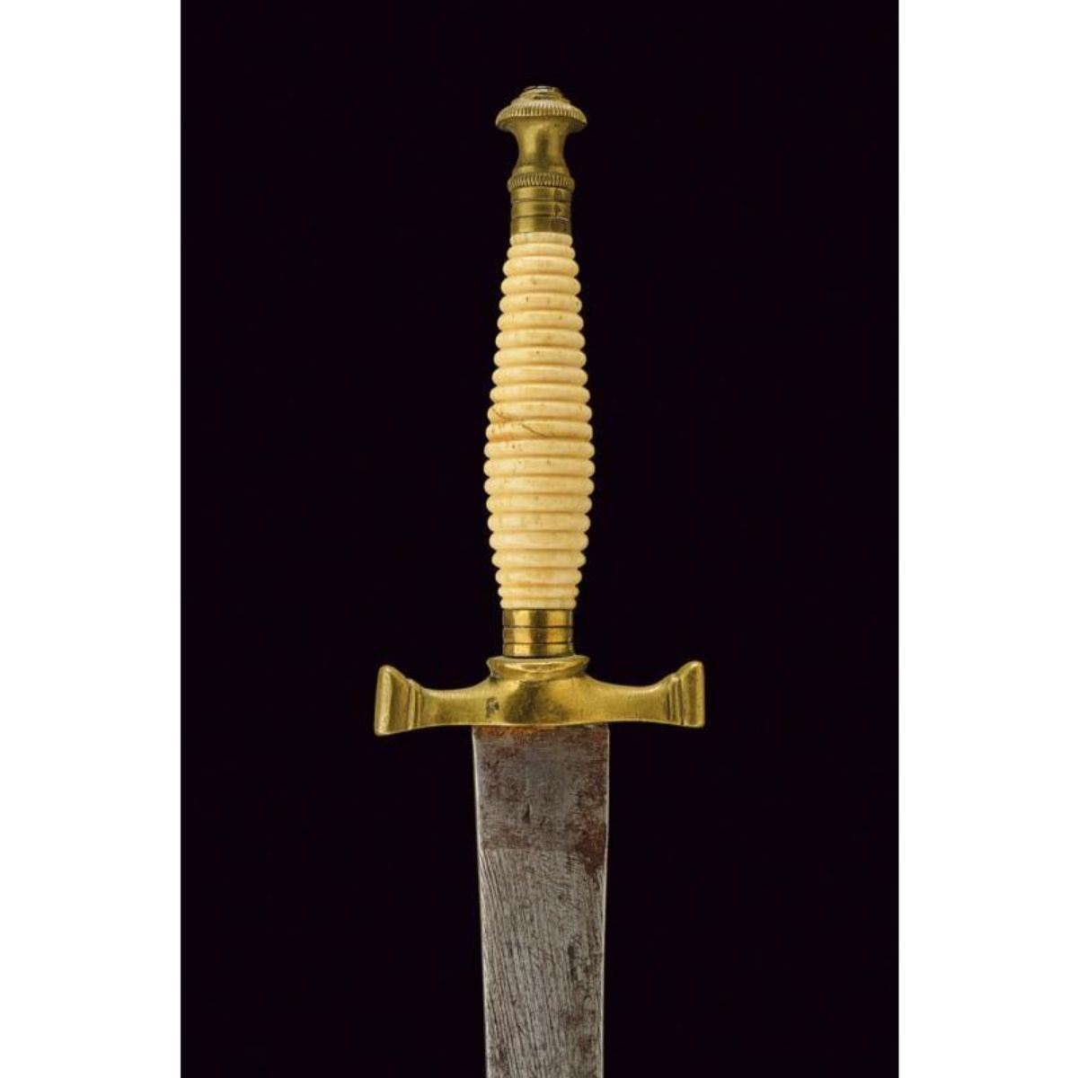 719thc Spanish blade with sheath. Daga Da Cadetto, straight blade without wires, of flat section; brass hoist numbered "61", handle in bone worked with anellatura ( restoration in the center ), brass cap. Metal sheath with brass fittings. 21 1/2" L ( 54.5 cm ). 10124-040518-CZ-00463