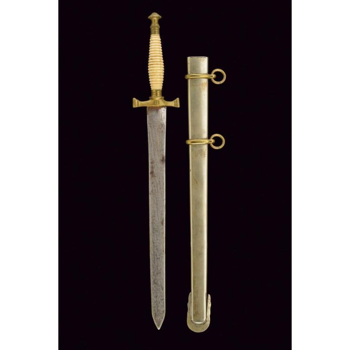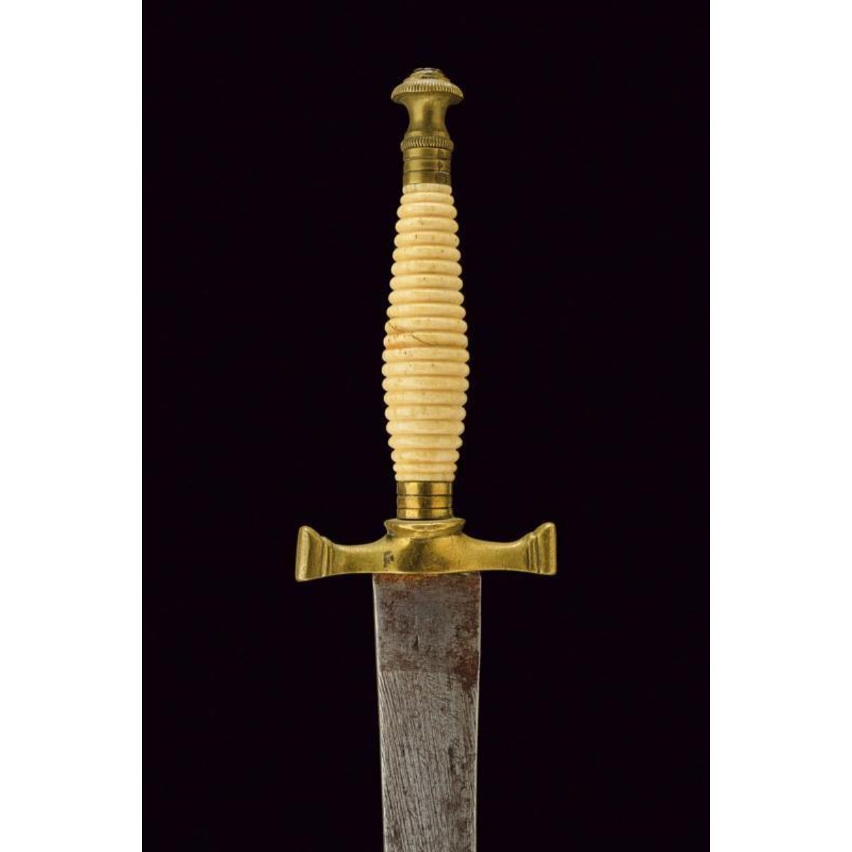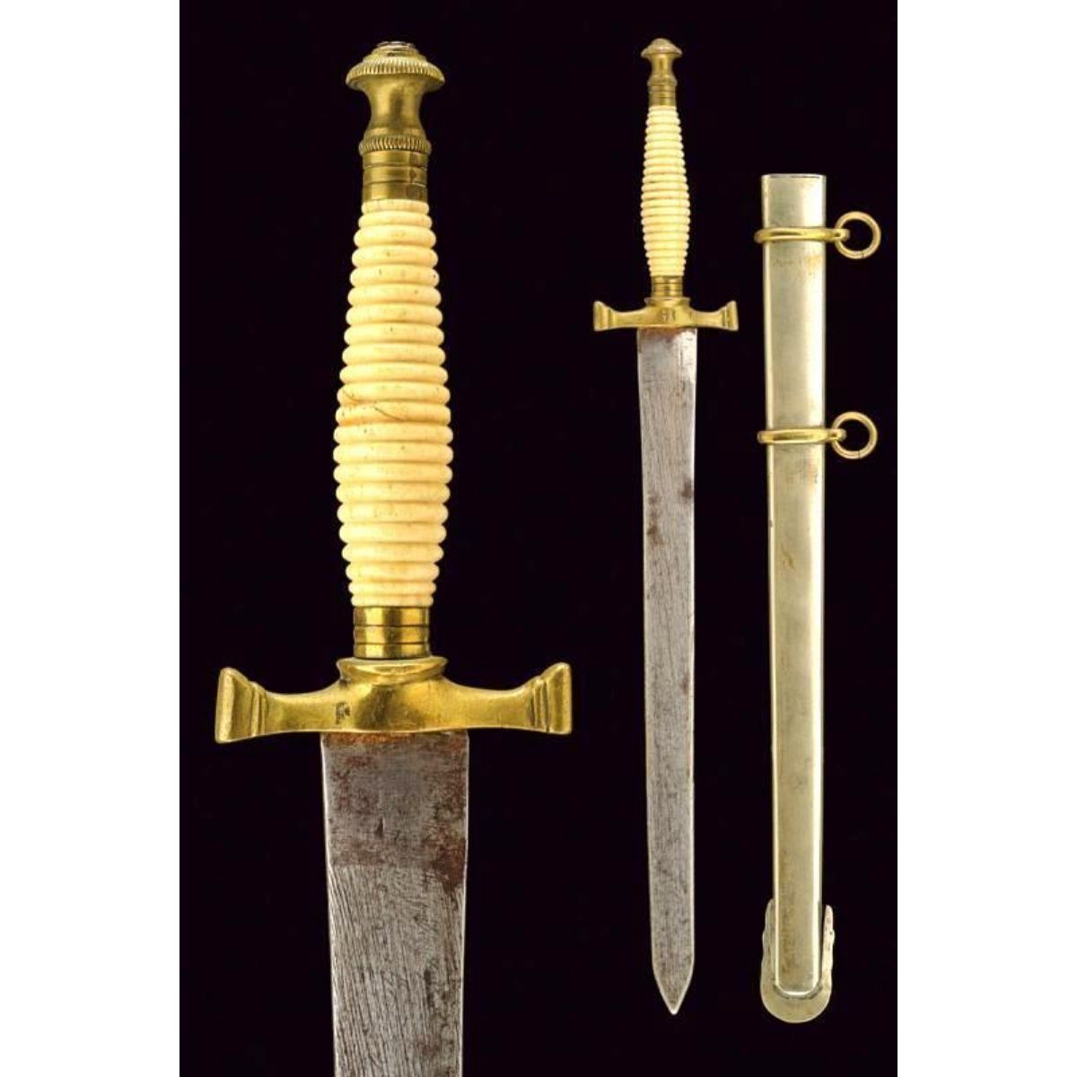 19thc Spanish blade with sheath. Daga Da Cadetto, straight blade without wires, of flat section; brass hoist numbered "61", handle in bone worked with anellatura ( restoration in the center ), brass cap. Metal sheath with brass fittings. 21 1/2" L ( 54.5 cm ). 10124-040518-CZ-00463
